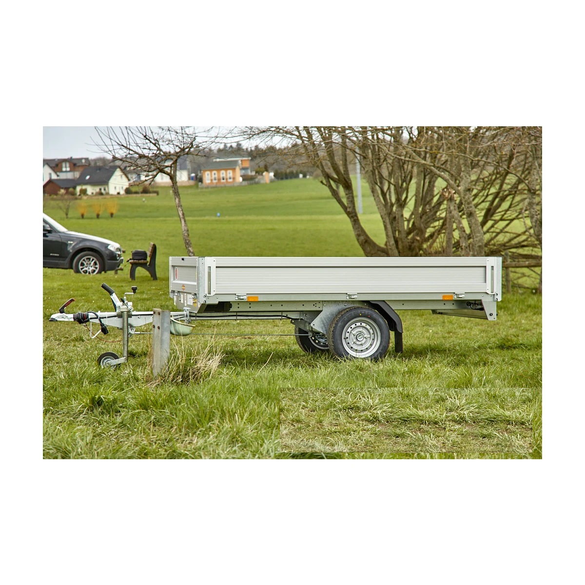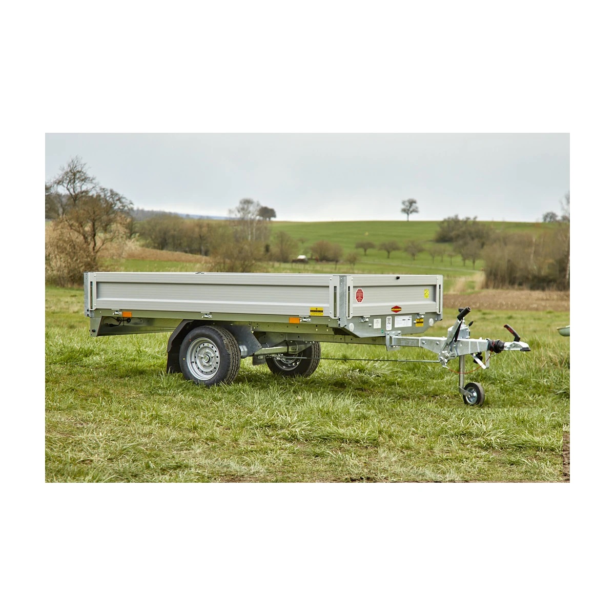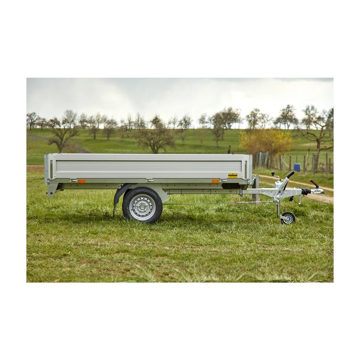 Die Konstruktion dieses Anhängers umfasst leichte, aber robuste Alu-Bordwände und vier stabile Zurrbügel in den Seitenblenden, die eine sichere Befestigung der Ladung ermöglichen.