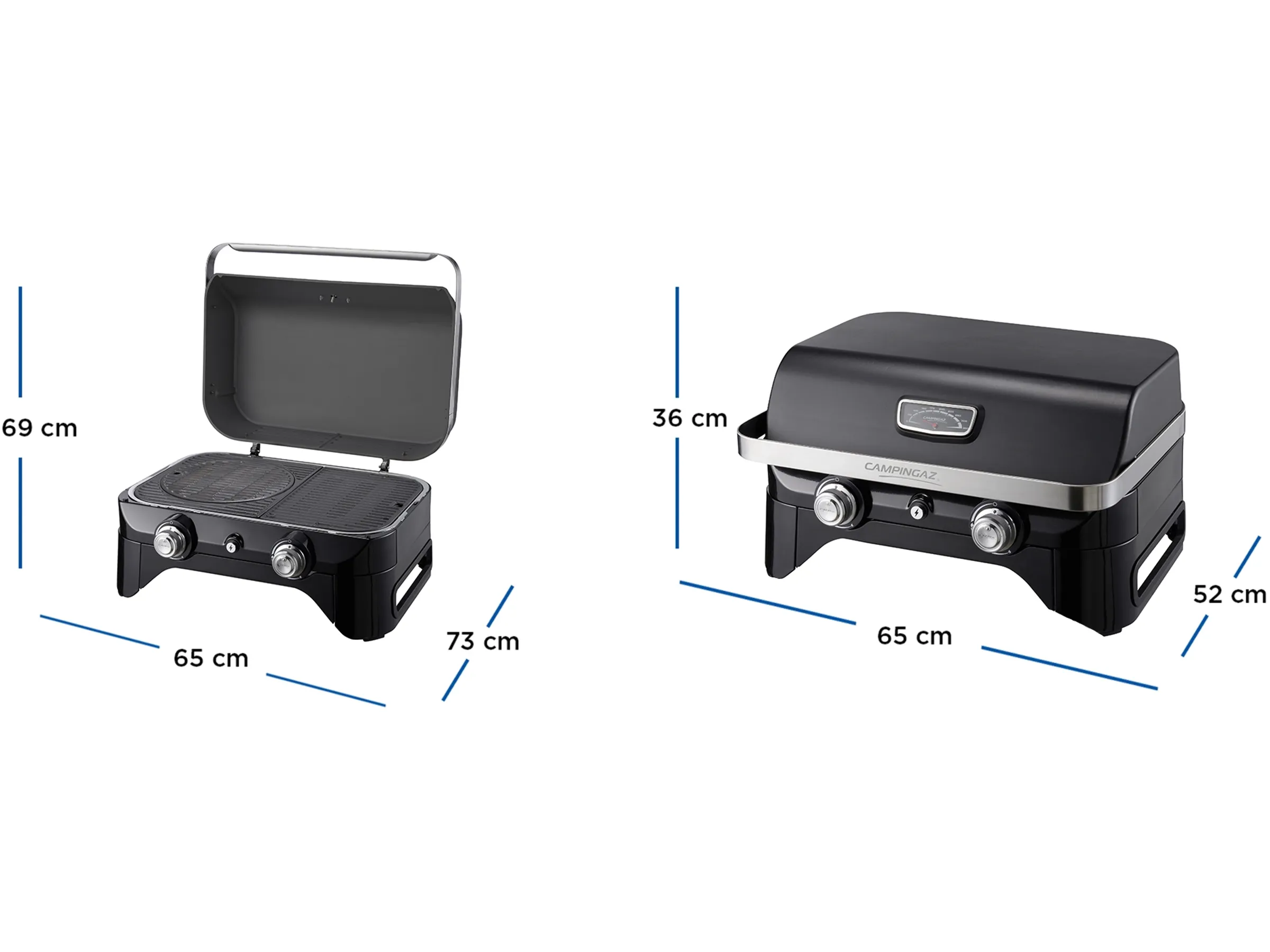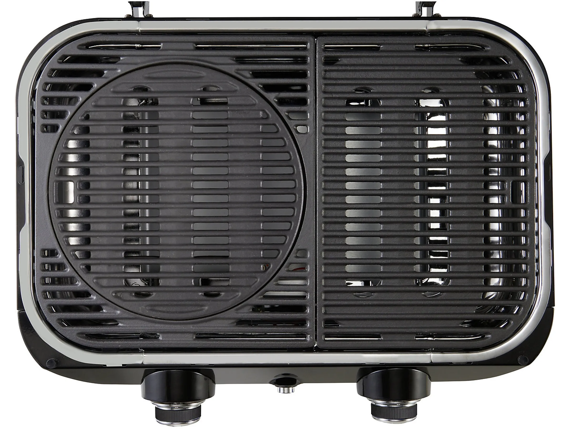 Die Bedienung ist kinderleicht: Zwei ergonomische Drehregler ermöglichen präzise Kontrolle über beide Hitzezonen, während das im Deckel integrierte Thermometer konstante Temperaturüberwachung bietet. Der Grill steht stabil, ist kompakt und lässt sich mühelos auf jedem Tisch positionieren.