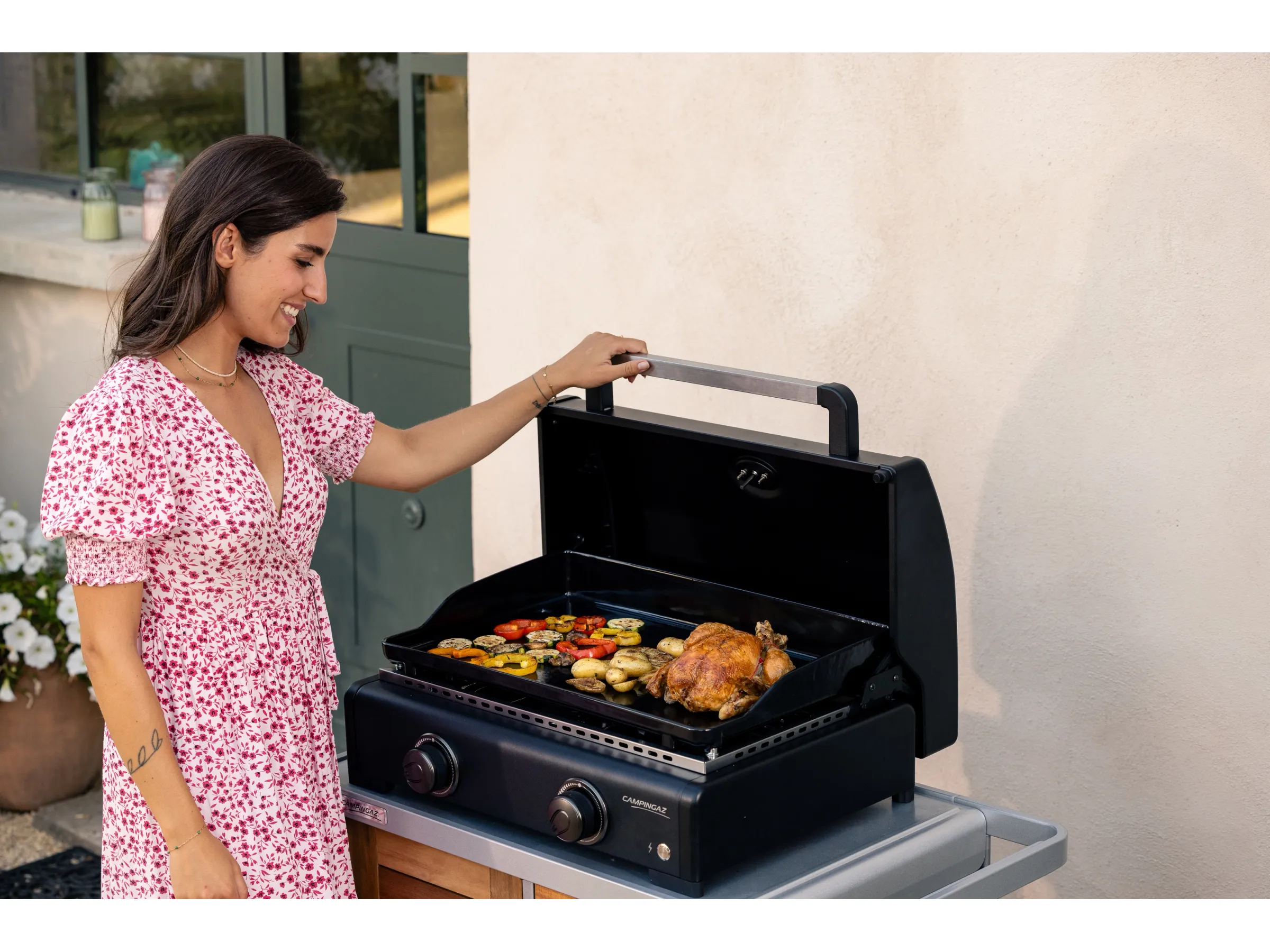 Die ergonomisch gestalteten Drehregler ermöglichen präzises Steuern der Hitze, sodass die Zubereitung selbst für Anfänger einfach und fehlerfrei ist. Der kompakte Aufbau macht die Plancha mobil und leicht aufzustellen, ideal für Balkon, Terrasse oder Camping.