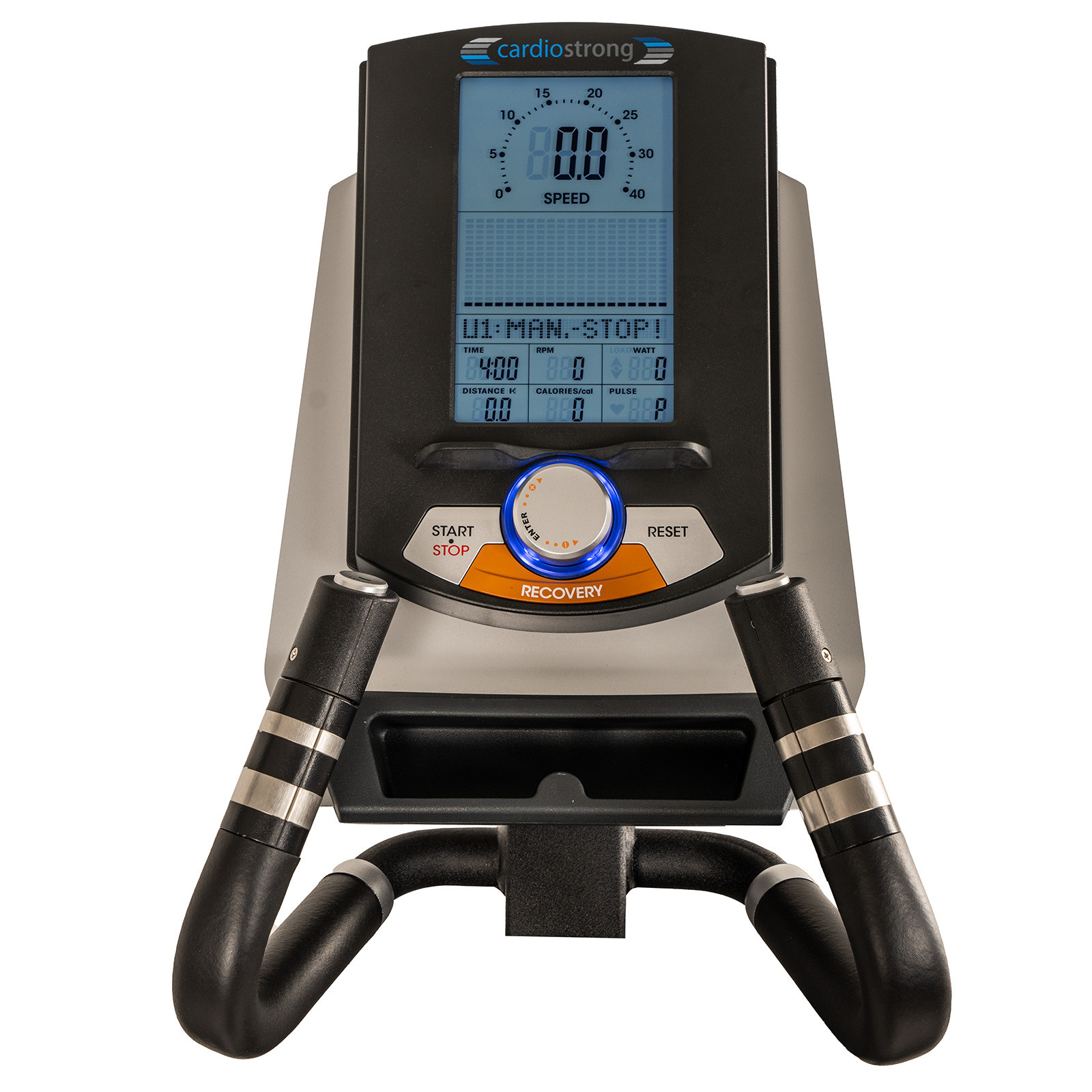 Die Trainingskonsole des cardiostrong Crosstrainer EX70 ist übersichtlich gestaltet und leicht zu bedienen. Wichtige Trainingsdaten wie Zeit, Geschwindigkeit, Distanz, Kalorienverbrauch und Herzfrequenz sind auf einen Blick ersichtlich.