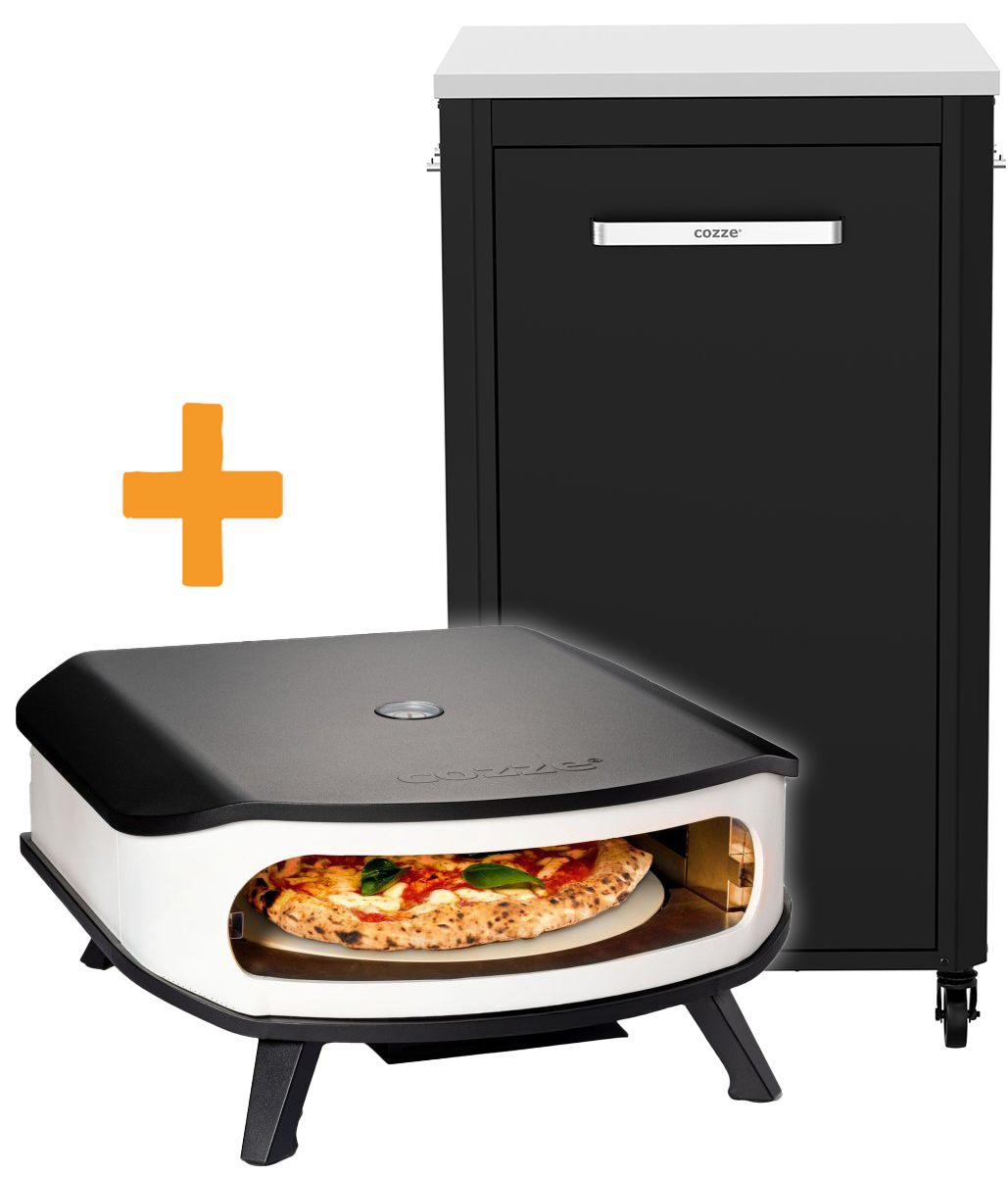 Dazu erhalten Sie einen robusten Outdoorschrank als idealen Stellplatz für den Pizzaofen. Das 1-türige Schrankmodul aus verzinktem, pulverbeschichtetem Stahl bietet eine edle Optik und eine hochwertige Edelstahl Arbeitsfläche. Mit 110 cm hat es die ideale Arbeitshöhe für die COZZE Pizzaöfen und im Innern lässt sich die Gasflasche perfekt verstauen.