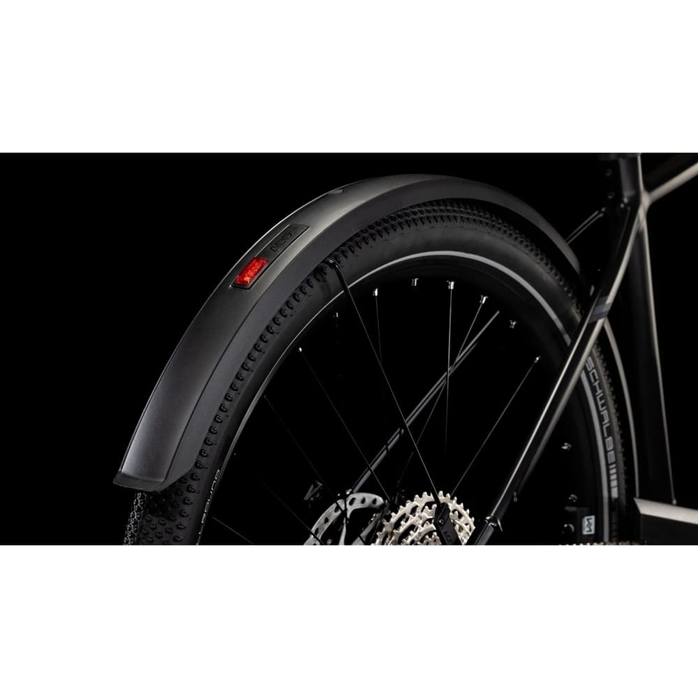 Dazu hat die 12-fach XT Schaltung von Shimano dank ihrem weiten Übersetzungsbereich auch auf steilen Anstiegen immer den passenden Gang parat. Auf die Newmen Performance 30 Laufräder haben CUBE breite, griffige Schwalbe G-One Allround Reifen aufgezogen, die mit jedem Straßenbelag oder Trail zurechtkommen. In puncto Sicherheit und Bremskraft bei jedem Wetter leisten die kraftvollen hydraulischen Shimano XT Scheibenbremsen zuverlässige Dienste. Viel praktisches Zubehör – Schutzbleche, Lichtanlage, Seitenständer – erledigt den Rest. Keine Frage, dieses Bike ist zu jeder Zeit für alles bereit.