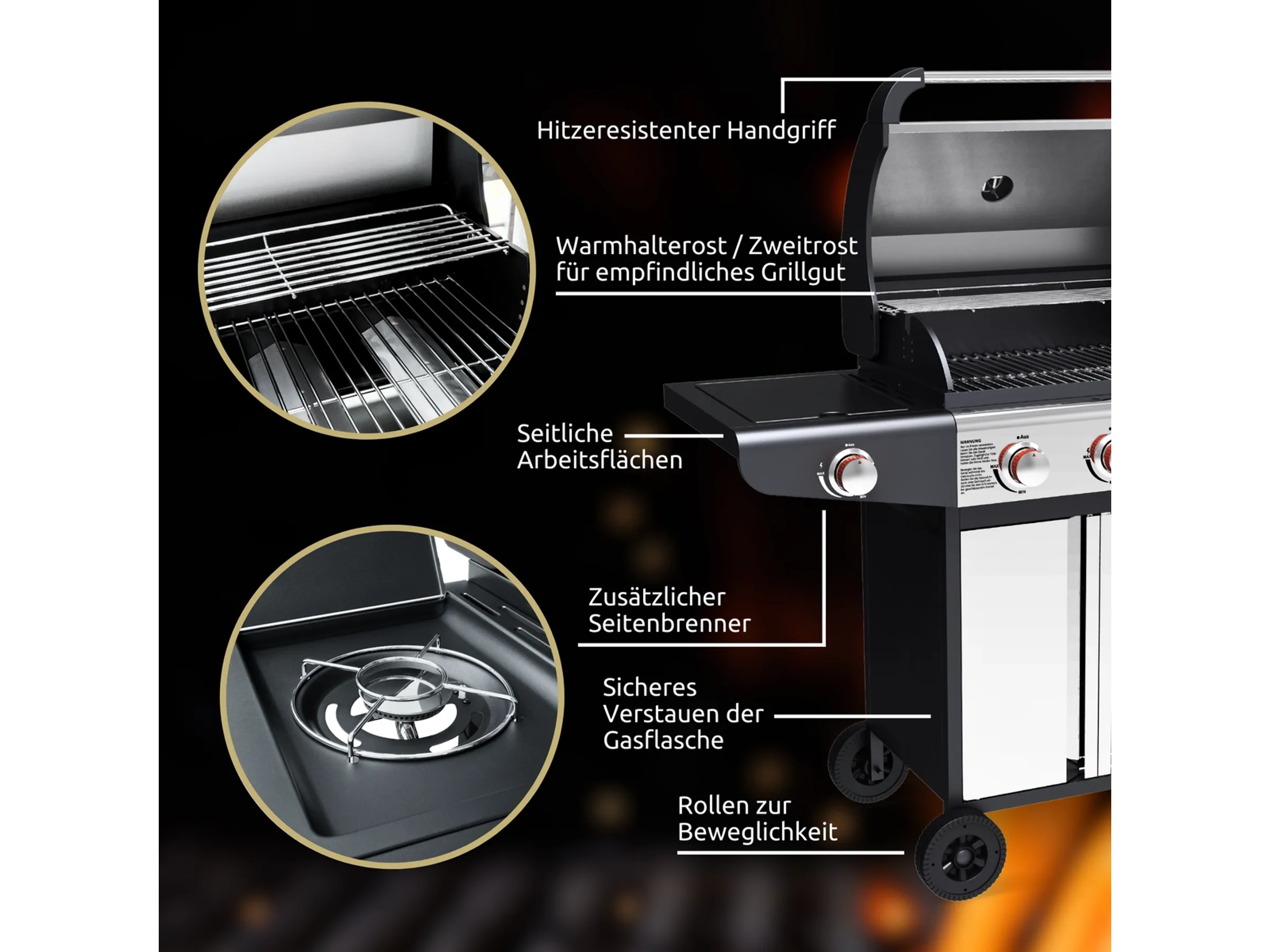 Die durchdachten Seitenablagen bieten praktische Ablageflächen für Grillutensilien, Teller oder Gewürze. Unterhalb des Grills befindet sich ein geräumiger Unterschrank für die Gasflasche, Zubehör oder Werkzeuge. Die eingebauten Rollen sorgen für Mobilität, während die Arretierungen Stabilität während des Betriebs gewährleisten.