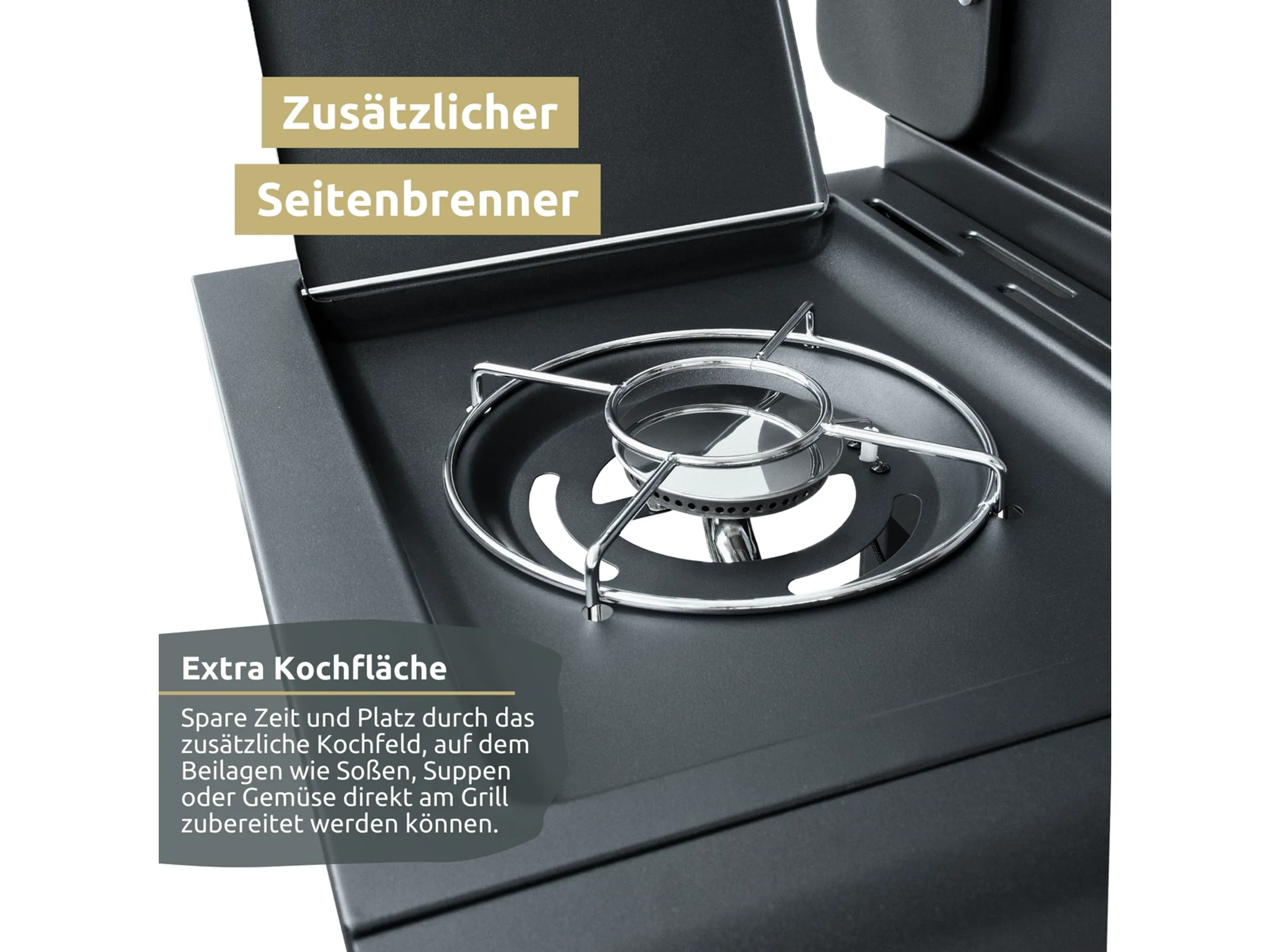 Ein integrierter Seitenbrenner bietet zusätzliche Flexibilität und erweitert die Kochmöglichkeiten erheblich. Dort lassen sich Saucen, Beilagen oder Gemüse separat zubereiten, ohne den Hauptgrill zu beanspruchen.