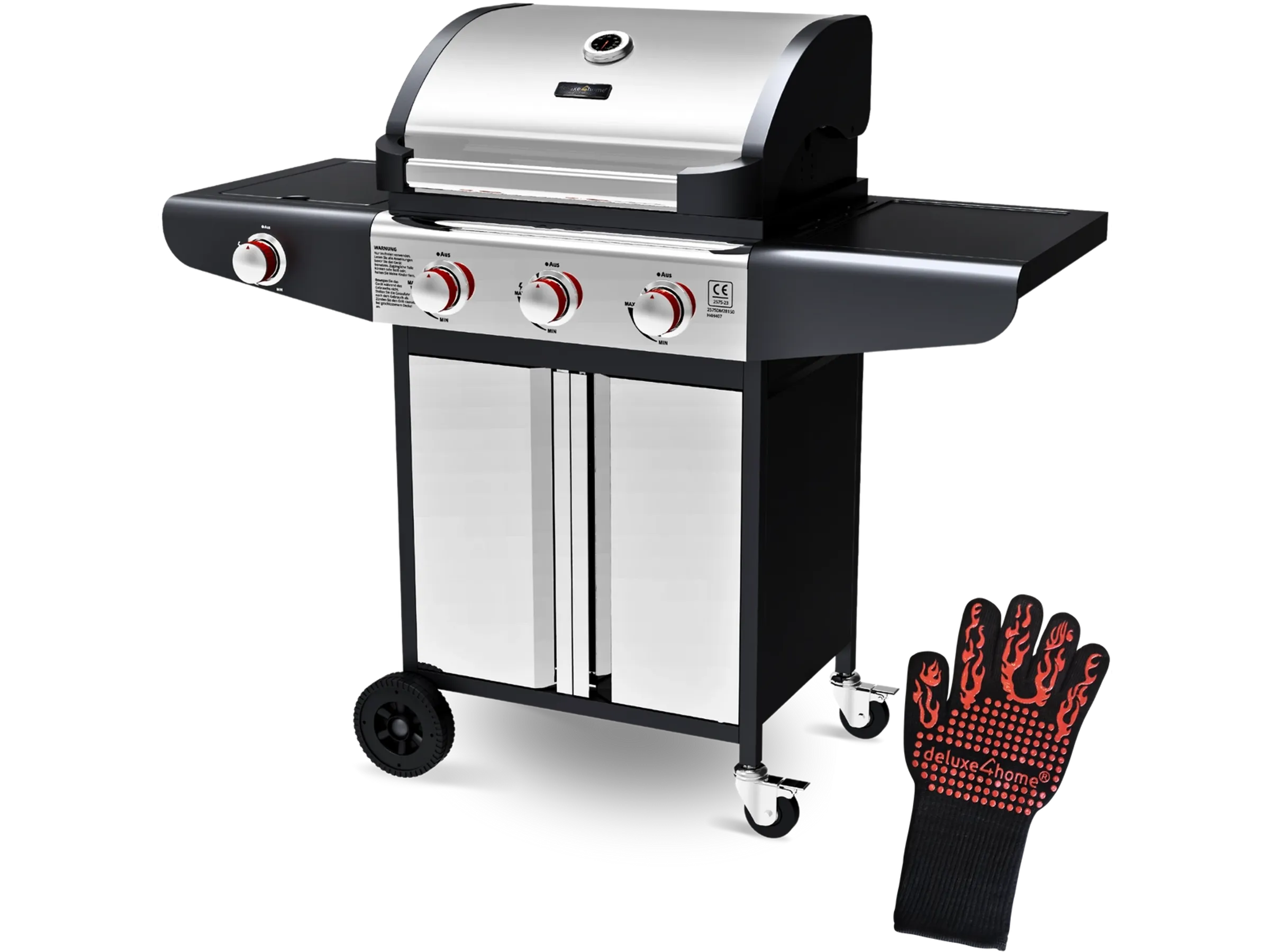 deluxe4home Grillwagen Gasgrill mit Deckel 3 Plus 1 Seitenbrenner Thermometer