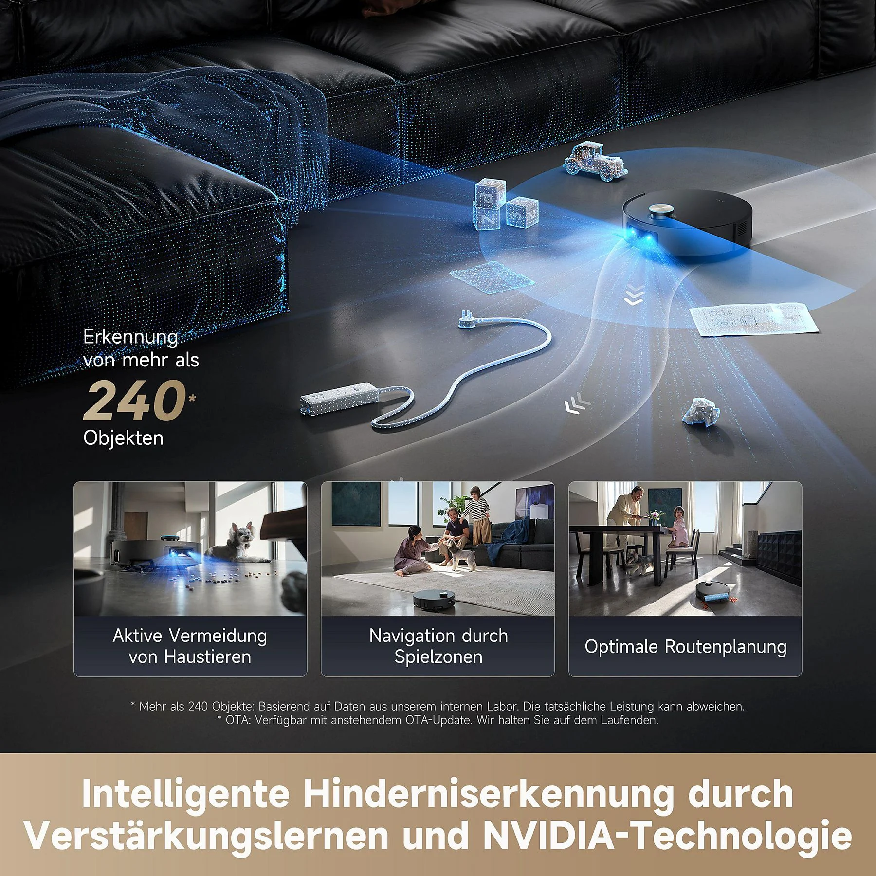 Zwei smarte Kameras erkennen über 240 verschiedene Gegenstände wie Kabel, Schuhe oder Haustiere in Echtzeit. Dadurch plant der Roboter seinen Weg sicher.