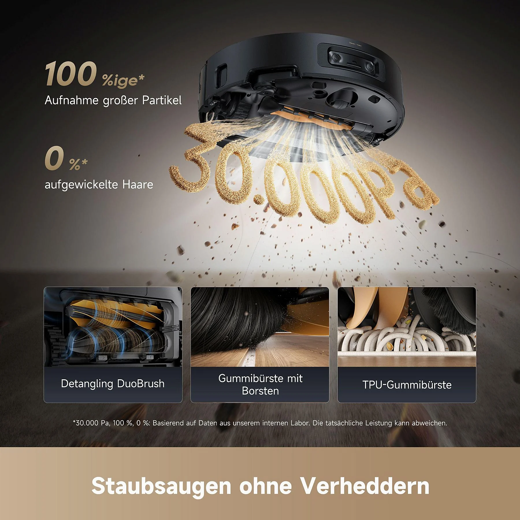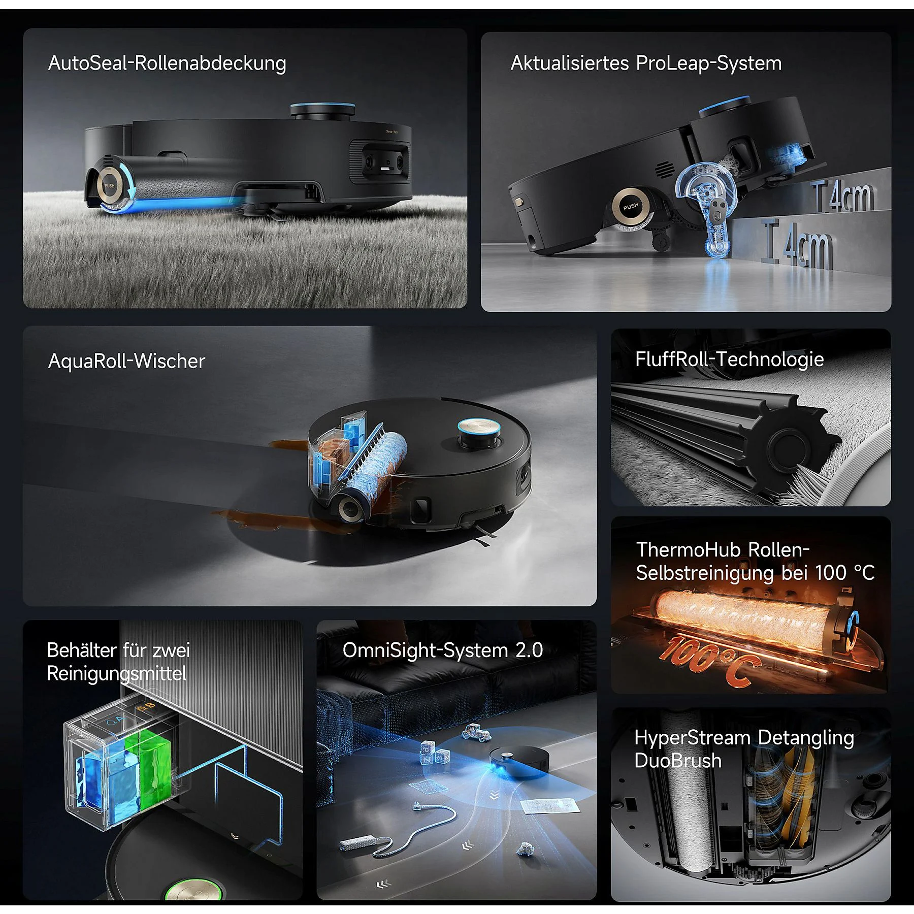 30.000 Pa Saugkraft, Warmwasser-Wischsystem, Wischmopp-Auflockerung durch gegenläufige Rotation, überwindet Hindernisse bis 8 cm, Teppicherkennung, Moppreinigung mit 100 °C heißem Wasser, Anti-Verhedderungsbürste, App- und Sprachsteuerung, einfahrbarer Laserturm |