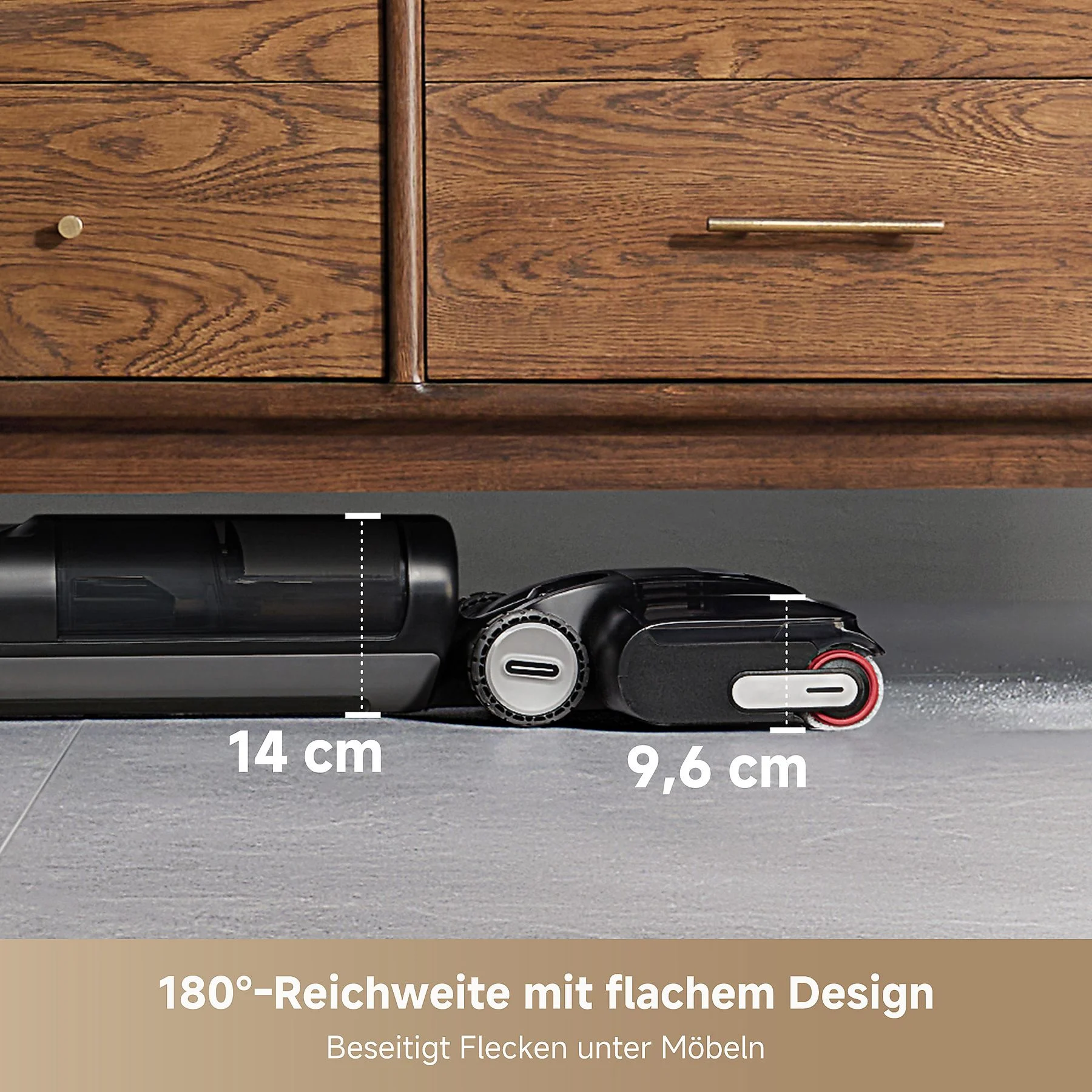 Dank seines 180°-Designs erreicht der Nass- und Trockensauger problemlos niedrige Bereiche bis zu einer Höhe von 14 cm, während die starke Saugkraft von 18.000 Pa sowohl feste als auch flüssige Verschmutzungen effizient beseitigt.
