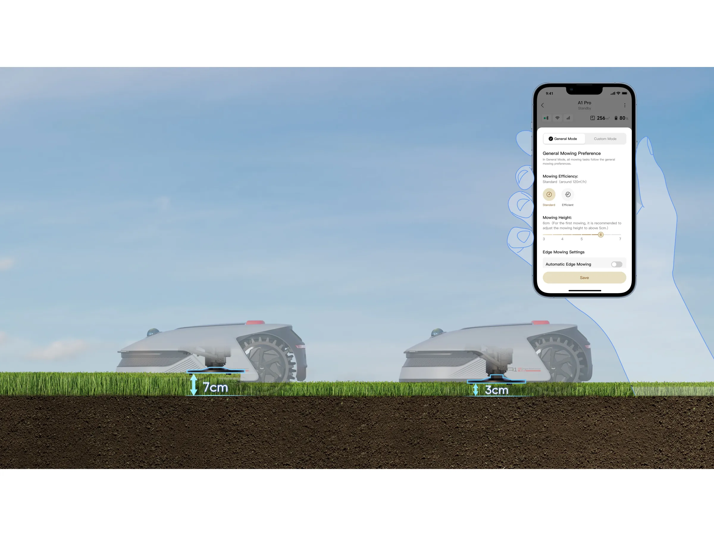 Dank seiner effizienten U-förmigen Wegeplanung kombiniert der A1 Pro präzise Technik mit erstklassiger Rasenpflege – für einen perfekt gleichmäßig gemähten Rasen, der nur wenige Klicks entfernt ist.