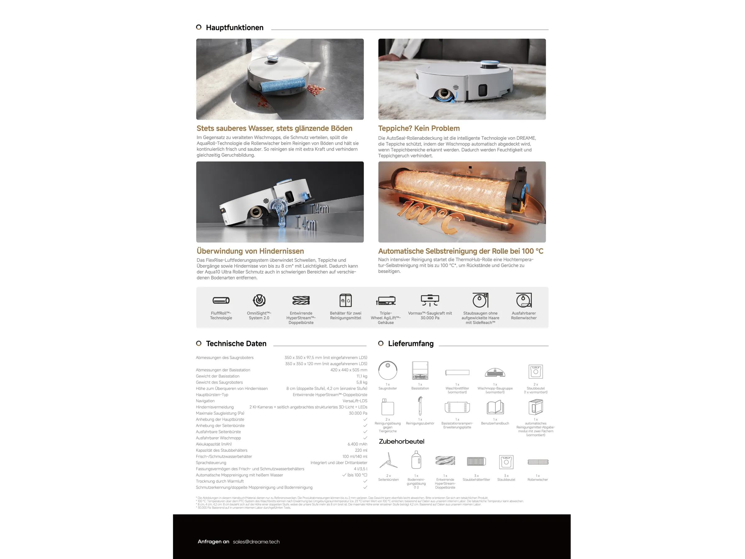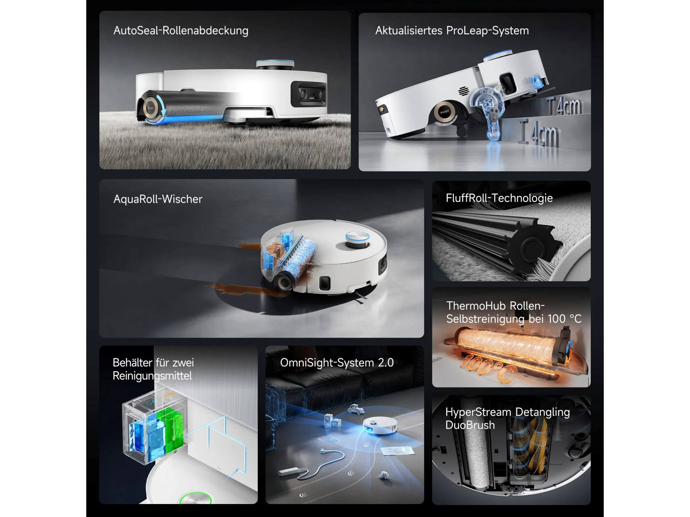 Sicherheitsfunktionen wie Absturzsensoren und Hinderniserkennung gewährleisten einen zuverlässigen Betrieb. Treppen oder empfindliche Gegenstände werden zuverlässig erkannt.