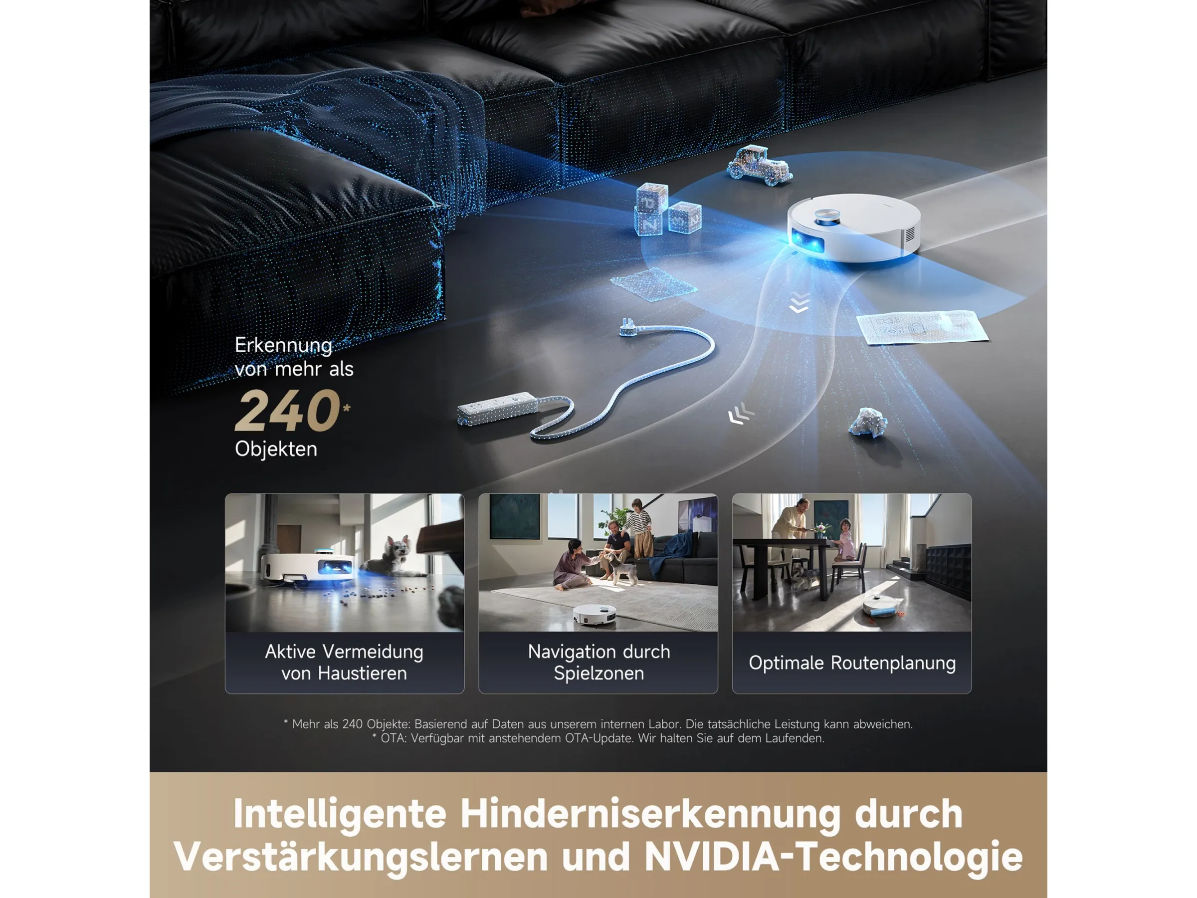 Zwei smarte Kameras erkennen über 240 verschiedene Gegenstände wie Kabel, Schuhe oder Haustiere in Echtzeit. Dadurch plant der Roboter seinen Weg sicher.