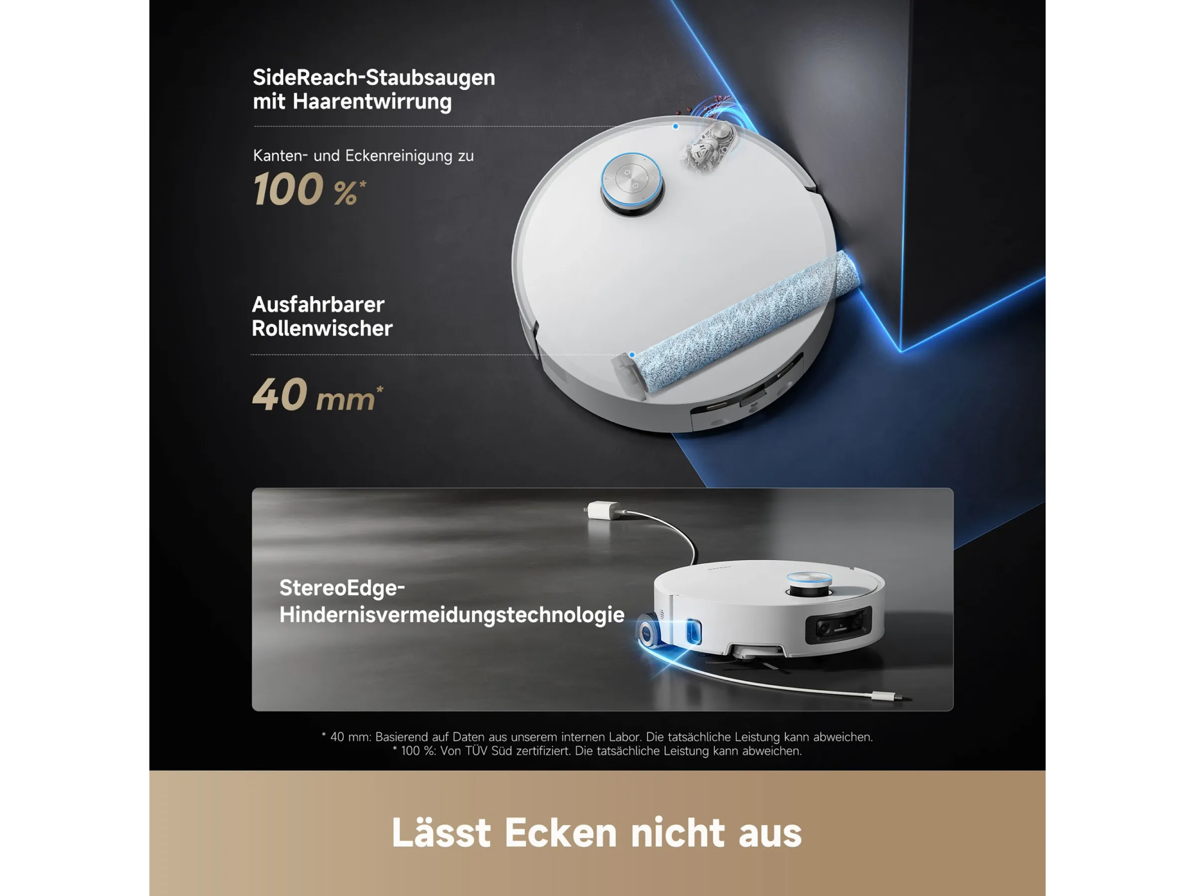 Der Roboter meistert doppelschichtige Hindernisse bis zu 8 Zentimeter Höhe problemlos. Der einfahrbare Laserturm ermöglicht die Reinigung unter niedrigen Möbeln. Zusätzlich sorgen ein ausfahrbarer Mopp und die Seitenbürste dafür, dass auch Kanten und Ecken gründlich sauber werden. Kein Bereich bleibt ungereinigt.