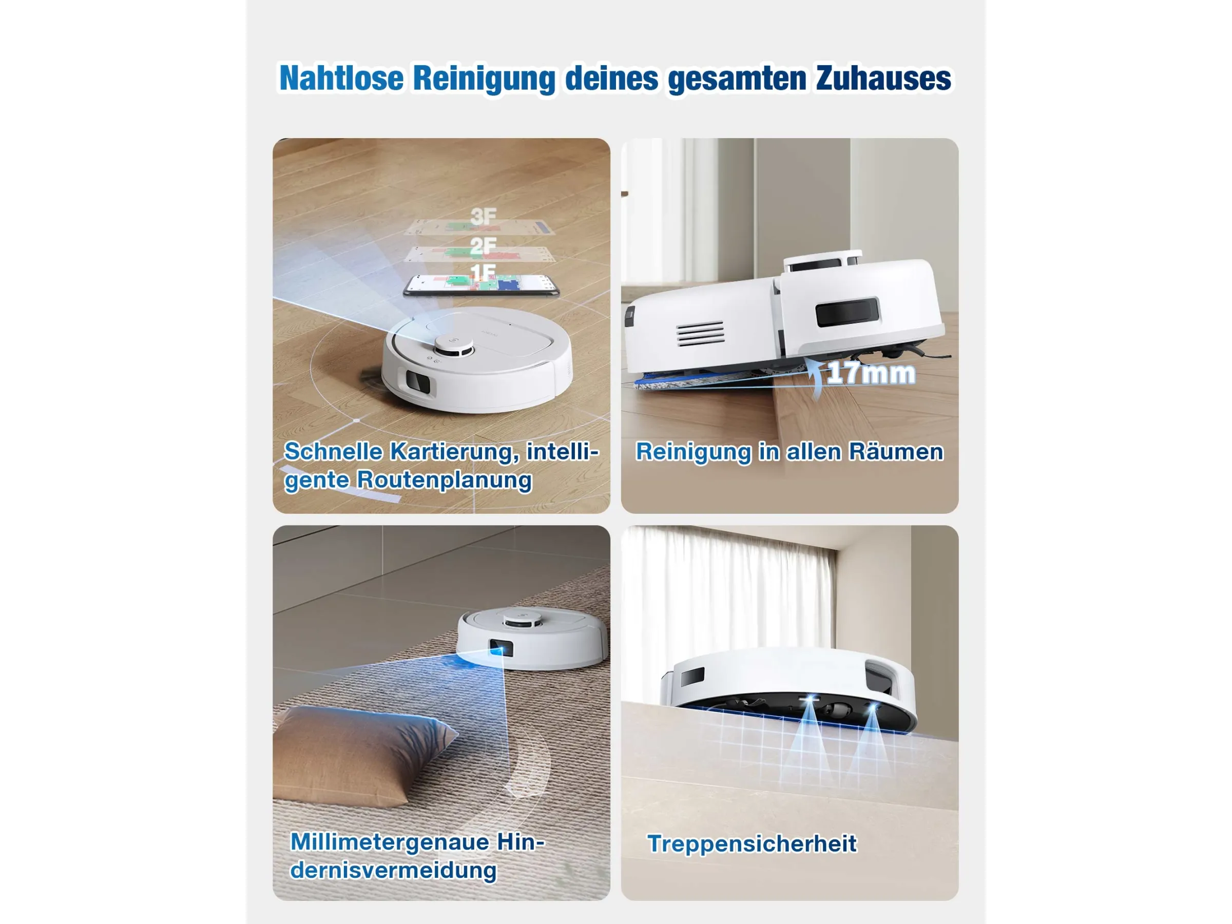 Diese Vielseitigkeit macht ihn zu einer praktischen Lösung für Haushalte mit gemischten Bodenarten. Ein Gerätewechsel oder manuelle Anpassungen sind nicht erforderlich.