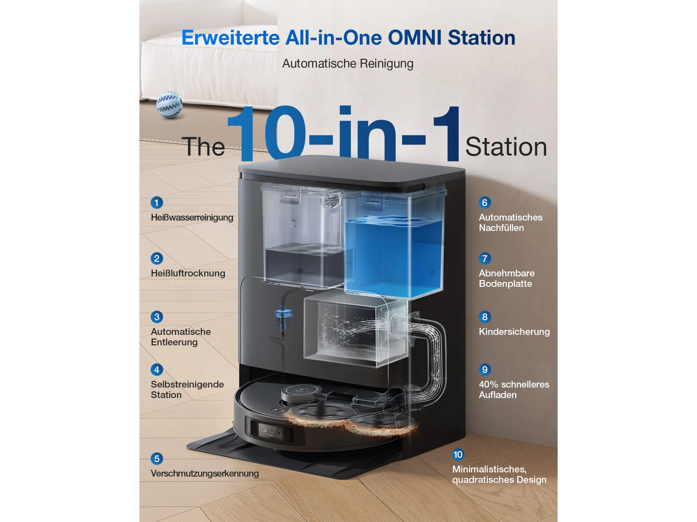 TrueMapping 2.0 sorgt in nur sechs Minuten für eine präzise Kartierung von bis zu 100 m², unterstützt von KI-Objekterkennung, Multikartenverwaltung und Absturzsicherung durch Bodensensoren. Teppiche werden per Ultraschall zuverlässig erkannt, die Mopps werden automatisch angehoben und die Saugleistung wird maximiert. Die OMNI-Station reinigt die Mopps mit 70 °C heißem Wasser, trocknet sie mit Heißluft und verhindert so Geruchsbildung sowie Keimentwicklung.