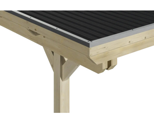 Im Lieferumfang enthaltenVorgefertigter Bausatz aus Leimholz (BSH-Fichte), farblich unbehandelt, Pfosten 12 x 12 cm, H-Pfostenanker zum Einbetonieren, Aluminium-Dachplatten mit Trapezprofil, Holz-Blende mit Aluminium-Abschlusskante, Regenrinne mit Fallrohr, Montagematerial