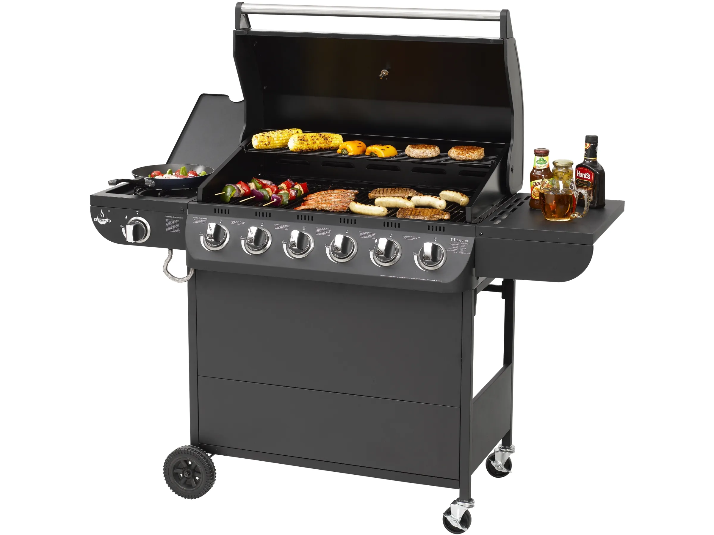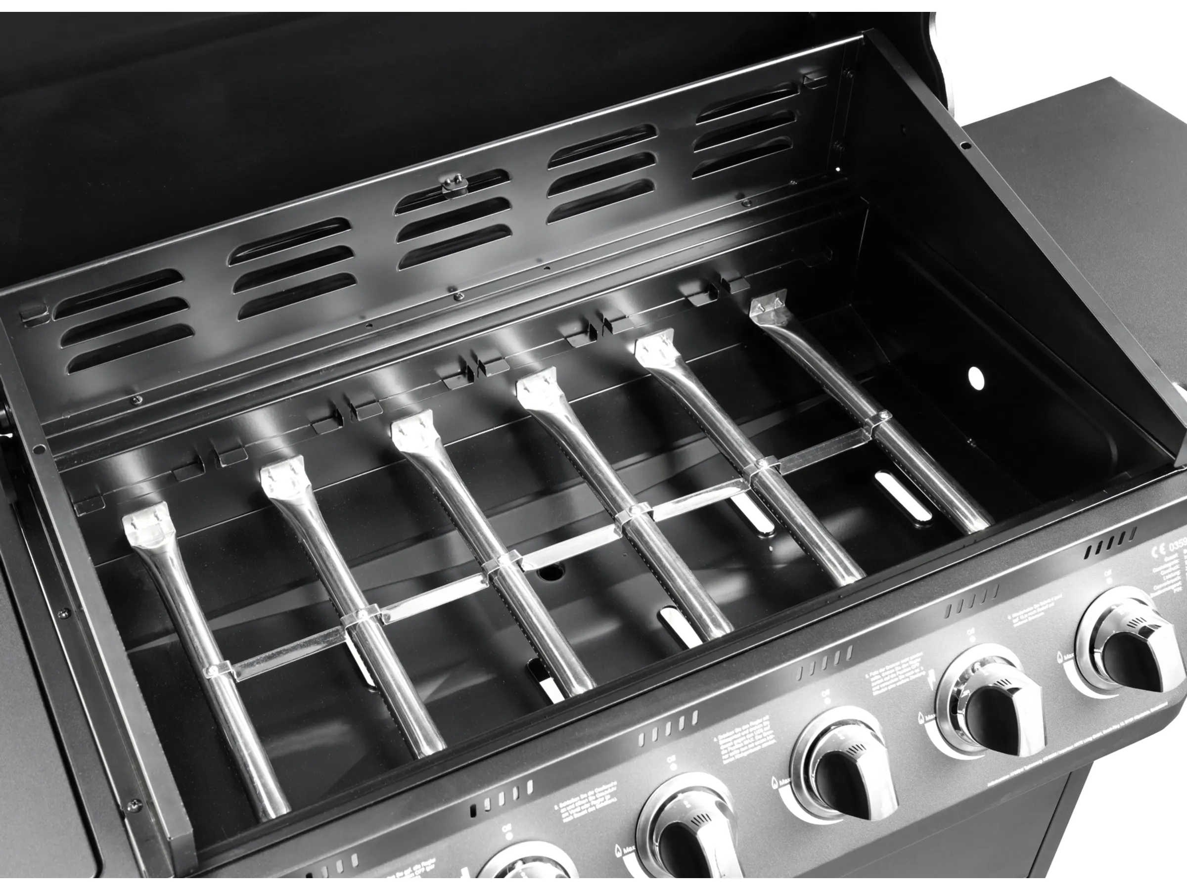 Monster-Grill für große Parties! 6 Brenner à 3,2kW = 19,2kW Power, Seitenbrenner für Saucen top. XXL-Rost 80x45cm, gleichmäßige Hitze, Schwarz edel!