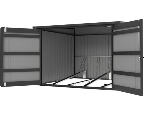 Dank der komfortablen Größe können Sie problemlos bis zu 4 Fahrräder unterbringen und haben zusätzlich noch die Möglichkeit, Helme oder Werkzeug an den im Lieferumfang enthaltenen S-Haken aufzuhängen. Hierfür finden Sie an den Tür-Flügeln entsprechende Geräteleisten.