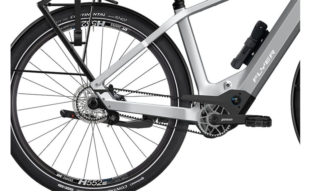 Das G1 Upstreet TR:CF 7.63 von Flyer ist ein hochwertiges Trekking-E-Bike mit einem leichten Carbon-Rahmen und einem leistungsstarken Pinion MGU E1.12 Mittelmotor mit 250 Watt.