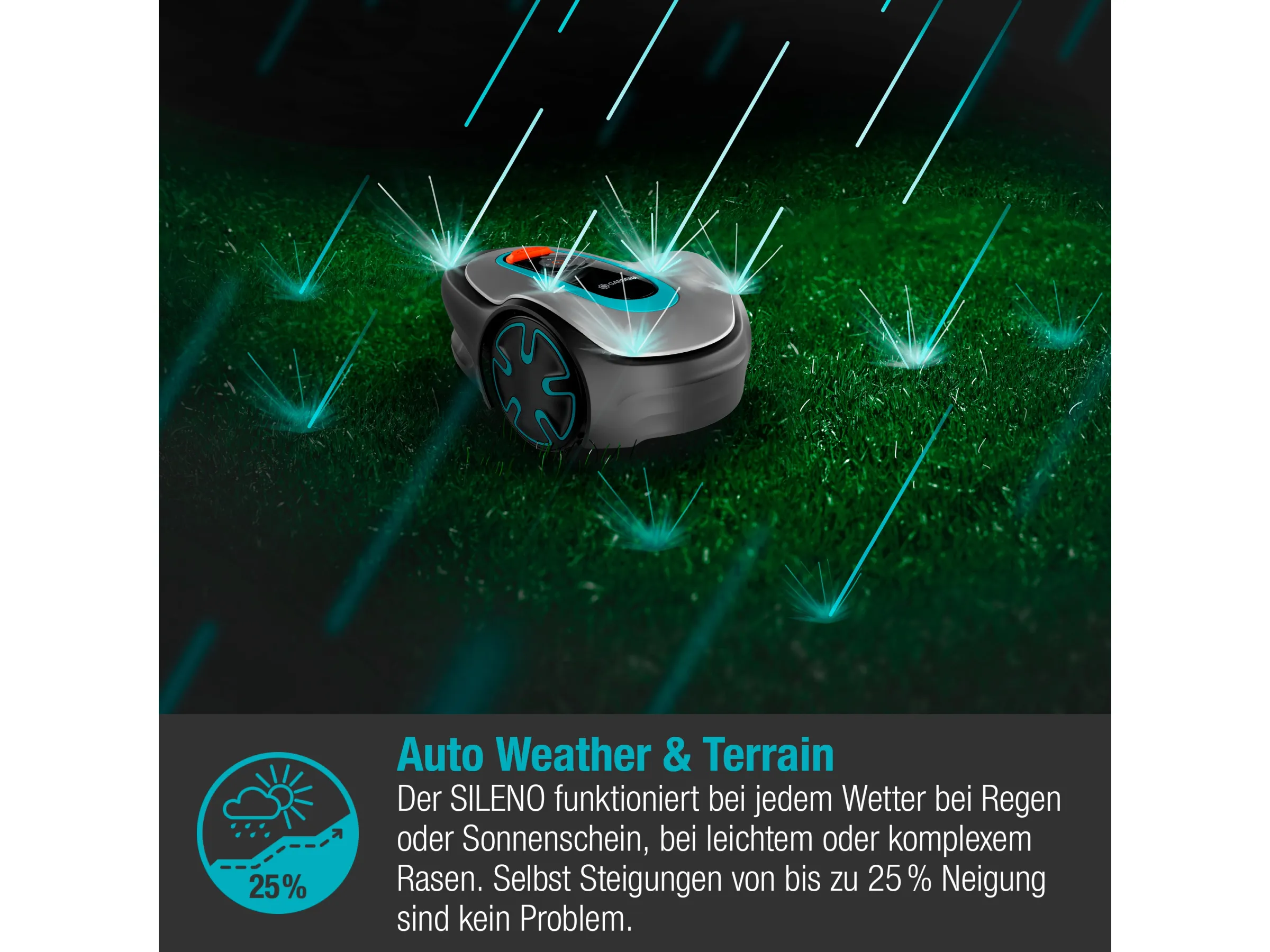 Der Gardena Mähroboter Sileno minimo ist für den Einsatz im Freien konzipiert und trotzt unterschiedlichen Wetterbedingungen. Regen, Feuchtigkeit oder wechselnde Temperaturen beeinträchtigen seine Funktion nicht.
