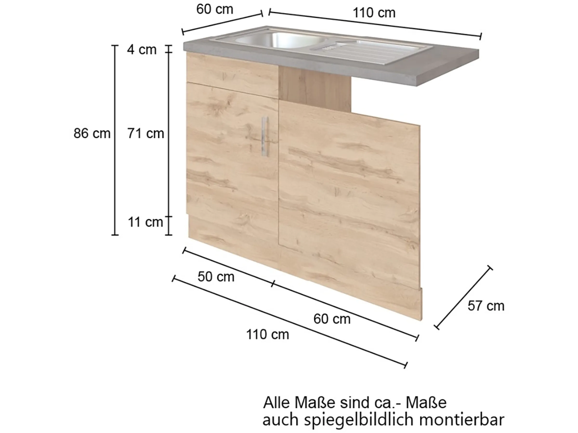 Held Möbel Küchen-Spülzentrum Sorrento 110x85x60cm Tür lende Sockel Weiß-W.Eiche