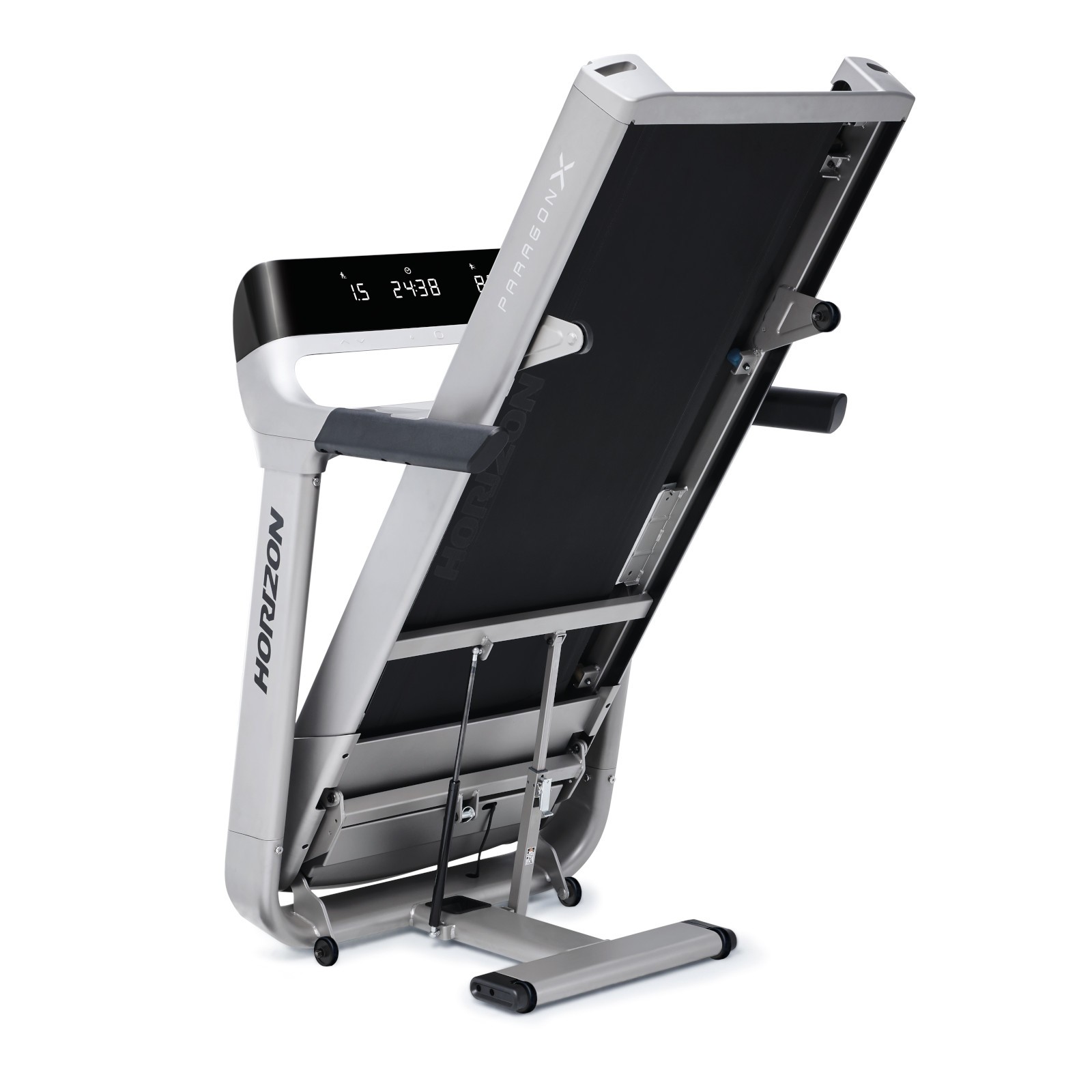 Das Paragon X von Horizon wurde aus hochwertigem Material gefertigt und überzeugt ebenso mit seinem modernen, ansprechenden Design. Die Bedienung gestaltet sich besonders intuitiv und leicht. Mit der One-Touch-Steuerung können Sie Ihr Workout besonders einfach starten und beenden. Dank der integrierten Schnellwahltasten in den Handläufen können Sie sowohl die Steigungs- als auch die Geschwindigkeitseinstellung verändern. Zugleich bieten die Touch-Buttons eine reibungslose und präzise Steuerung von Steigung und Geschwindigkeit. Mit den integrierten Transportrollen und dem Klappmechanismus lässt sich das Paragon X schnell und einfach verschieben.