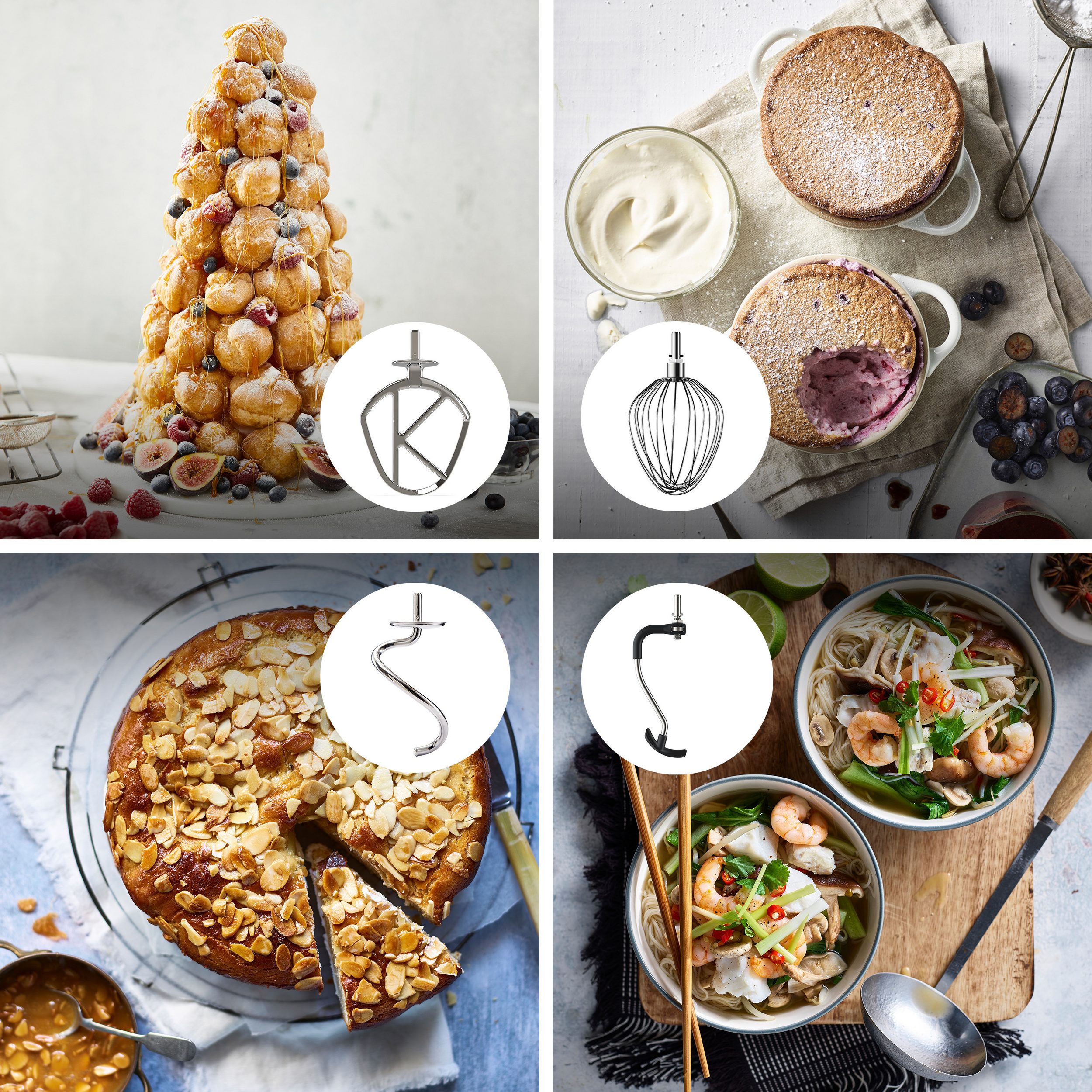 | Mitgeliefertes Zubehör | K-Haken, Ballonschneebesen, Knethaken, Flexi-Rührelement, Koch-Rührelement, 1,6 l ThermoResist Glas-Mixaufsatz, Multi-Zerkleinerer inkl. 6 Edelstahl-Arbeitsscheiben, Dampfgarsieb, 6,7 l Rührschüssel, Spritz-und Hitzeschutz |