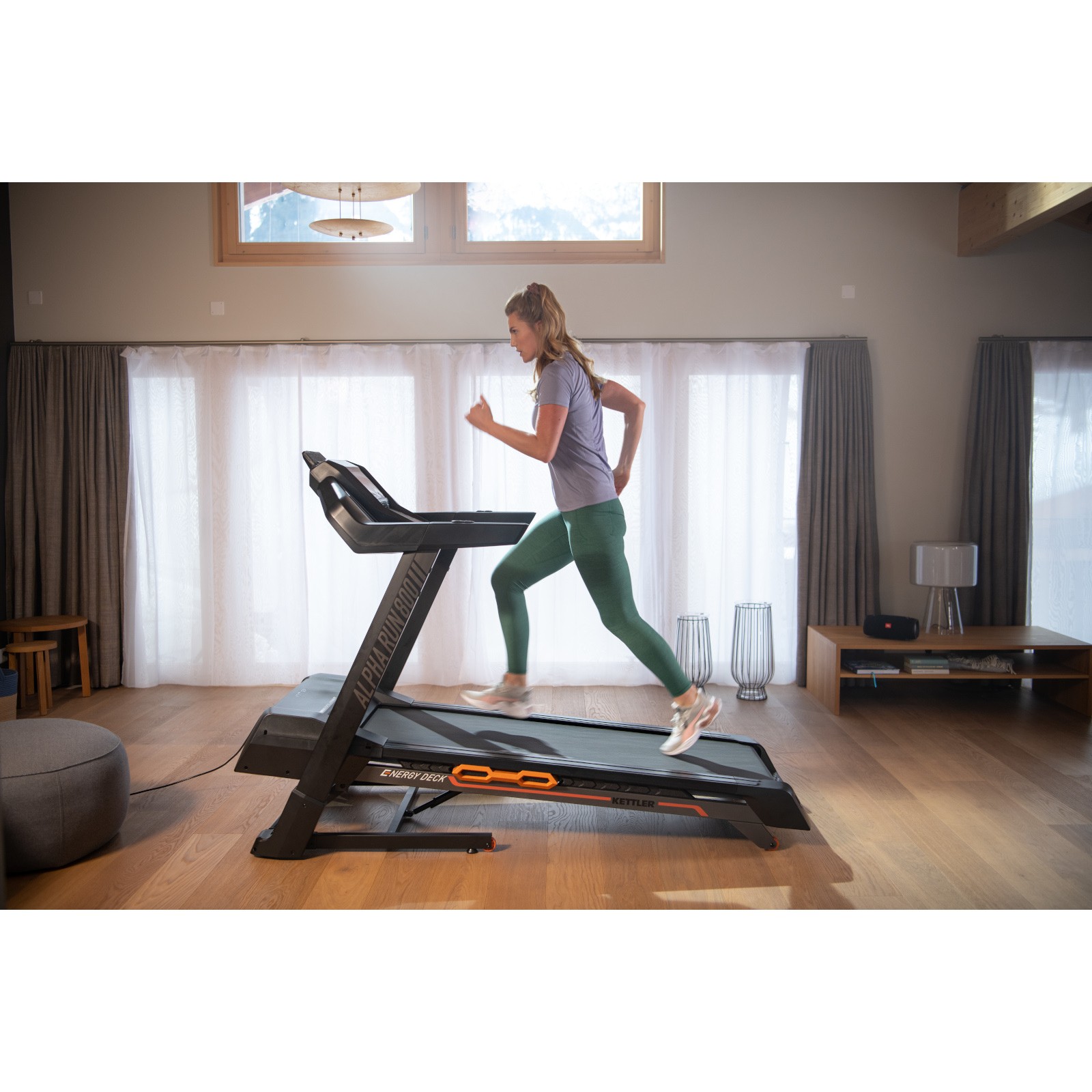 Auf Basis des hochwertigen „Kettler Energy Deck“ haben Sie dank eines speziellen Dämpfungsschaumes, der in Energy-Elementen unter der Lauffläche in Wabenform verarbeitet ist, ein besonders weiches Laufgefühl. Neben den dämpfenden Eigenschaften besitzt dieses spezielle Material einen Rebound, sprich Rückfedereffekt. Ein Teil der von Ihnen investierten Energie wird an Sie zurückgegeben und unterstützt Sie beim Training.