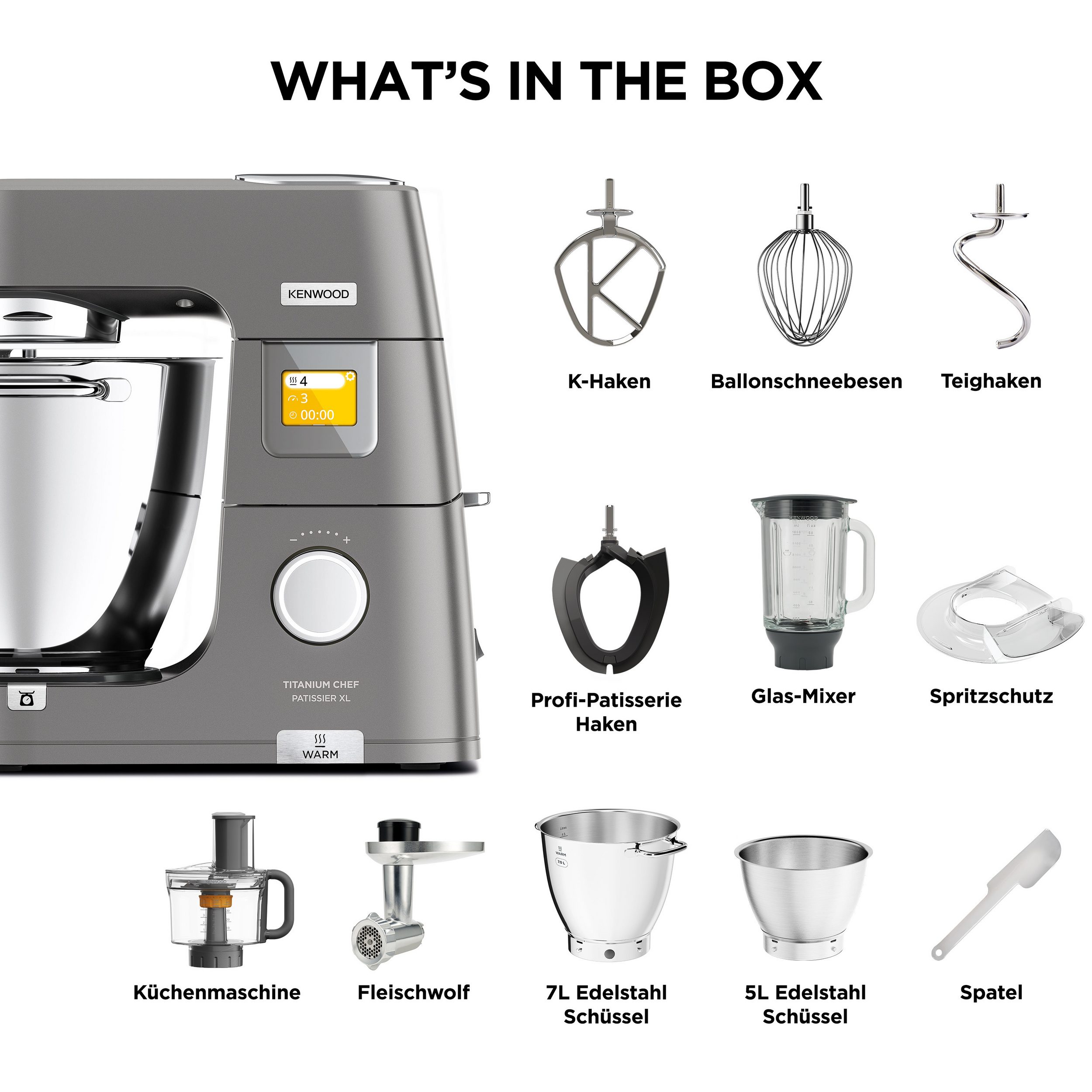 - Zubehör: 3 teiliges Patisserie-Set, Flexi-Rührelement, 1,6 l ThermoResist Glas-Mixaufsatz, Fleischwolf mit 3 Scheiben, Multi-Zerkleinerer, 7 l Rührschüssel, Spritzschutz