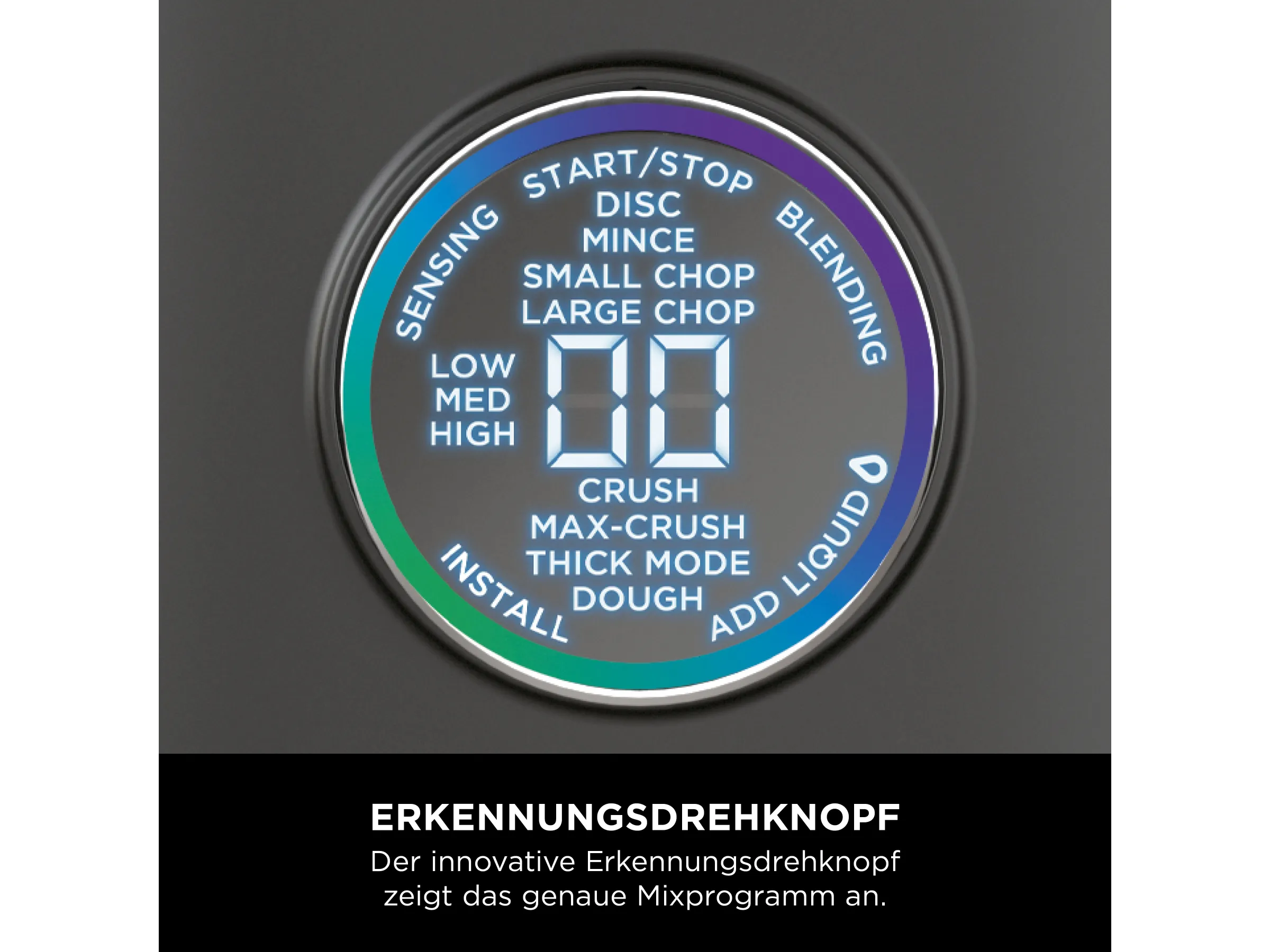Den Detect Drehschalter verwenden, um einen voreingestellten Modus auszuwählen, damit der Mixer die Arbeit übernimmt. Voreingestellte Modi für grobes Hacken, feines Hacken und Zerkleinern, um Fleisch zu zerkleinern sowie Nüsse, Bohnen, Hülsenfrüchte und Gemüse im großen Mixgefäß oder in der Küchenmaschinen-Schüssel zu hacken oder zu würfeln. Wenn die wendbare Schneide-/Raspelscheibe und die Küchenmaschinen-Schüssel genutzt werden soll, ist auch die Verwendung des Disc-Modus ist möglich.
