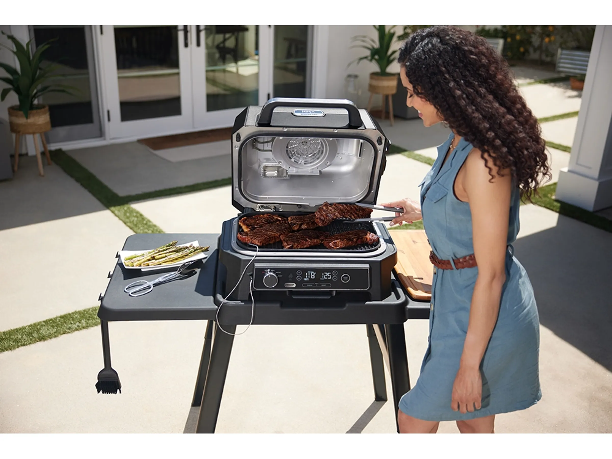 Du kannst mit offenem Deckel grillen, um ein authentisches Grillerlebnis zu erhalten, oder den Ninja bei geschlossenem Deckel arbeiten lassen, um dicke Fleischstücke oder gefrorene Lebensmittel perfekt zuzubereiten. Dank des elektrischen Betriebs brauchst du weder Holzkohle noch Gas zu kaufen.