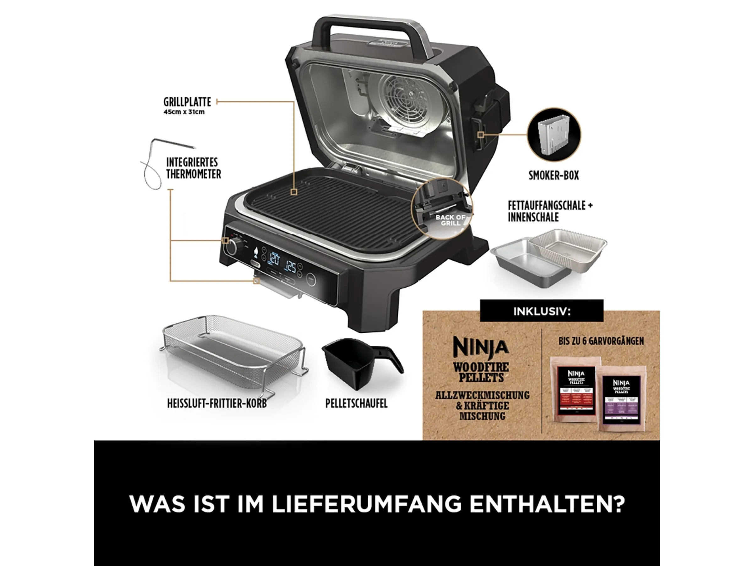 Die integrierte Smoker-Box sorgt für ein authentisches, reichhaltiges Holzfeuer-Aroma, während ein Konvektionsgebläse die Hitze und den Rauch gleichmäßig um die Speisen herum verteilt.