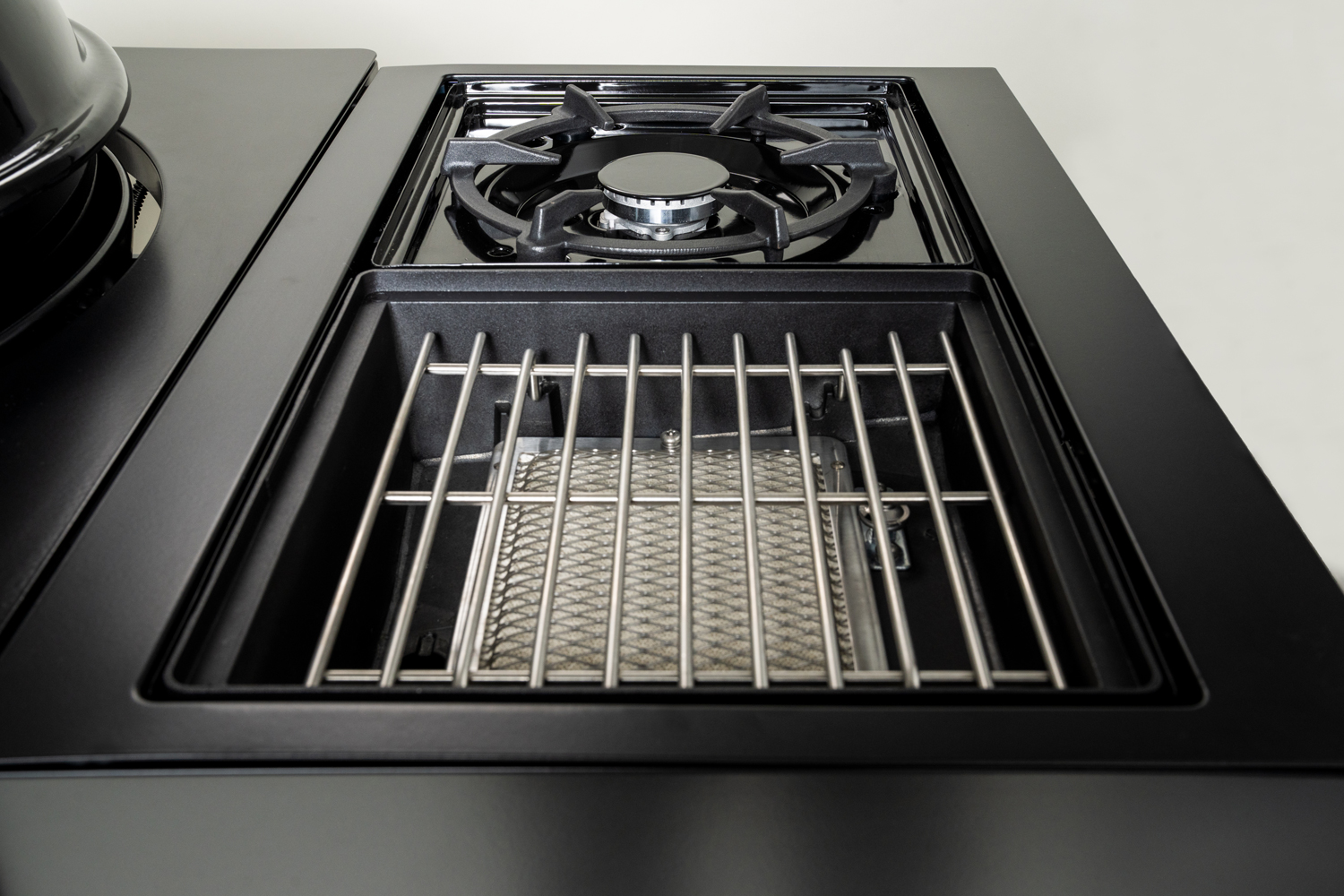 - mit Blazing-/ Cooking Zone: Infrarotbrenner mit bis 900°C + Ringkocher mit Gusseisen-Topfständer