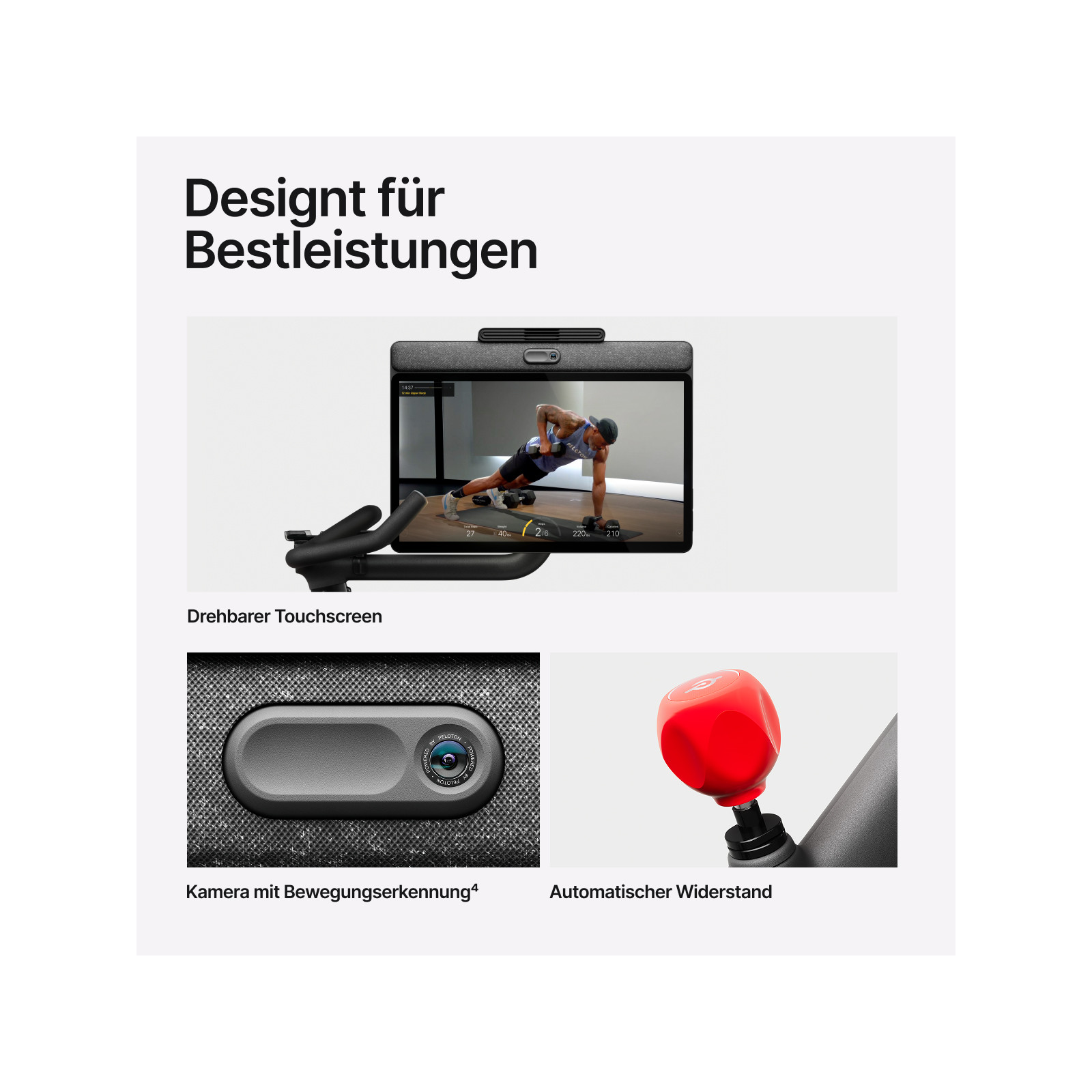 - Persönliche Betreuung mit intelligentem Krafttraining, unterstützt durch Peloton IQ – Bewegungserkennungskamera ermöglicht ein personalisiertes Cardio- und Krafttraining, das Ihre Trainingseinheiten für Sie plant, Ihre Fortschritte verfolgt und sogar Ihre Haltung korrigiert