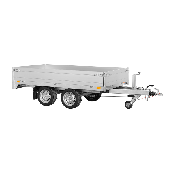 Dank der niedrigen Ladehöhe und der leicht bedienbaren Auffahrrampen wird das Be- und Entladen besonders einfach. Die große Ladefläche von 276 x 170 cm bietet ausreichend Platz für unterschiedlichste Ladungen. Die Bordwände können bei Bedarf abgenommen werden, wodurch der Anhänger flexibel an verschiedene Transportaufgaben angepasst werden kann.