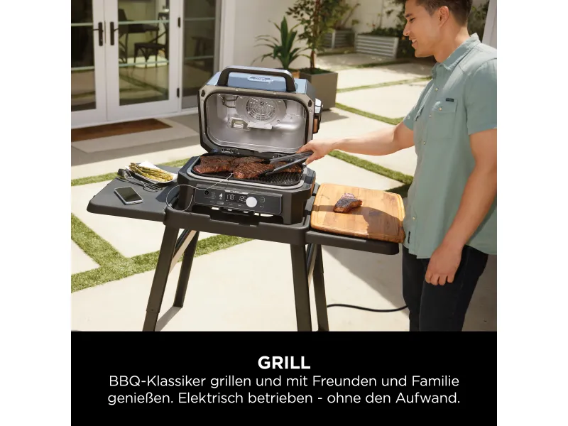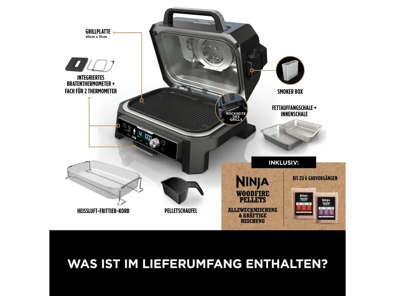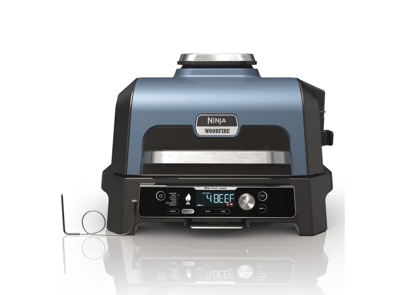 Der integrierte Thermometer sorgt für perfekt gegarte Ergebnisse, sodass kein Rätselraten mehr notwendig ist. Der Ninja Woodfire wird mit Strom betrieben, lässt sich schnell aufheizen und sorgt für ein authentisches Holzfeuer-Aroma.