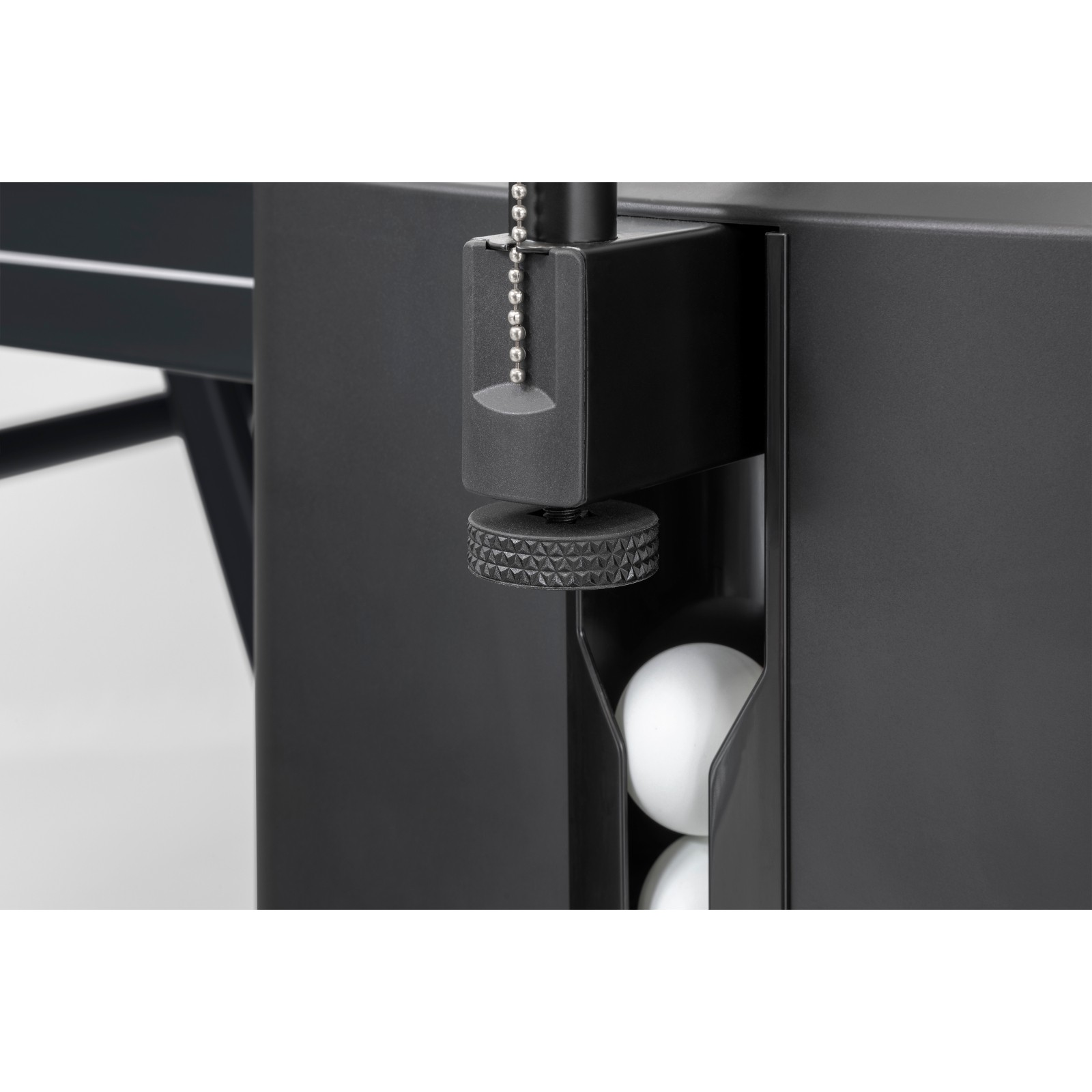Die TT-Platte Design Line verfügt über ein Schlägerfach, das Platz für 2 Schläger und z.B. ein Mobiltelefon bietet. Zusätzlich ist die TT-Platte an jeder Seite mit Ballhalter für jeweils bis zu 3 Bälle ausgestattet.
