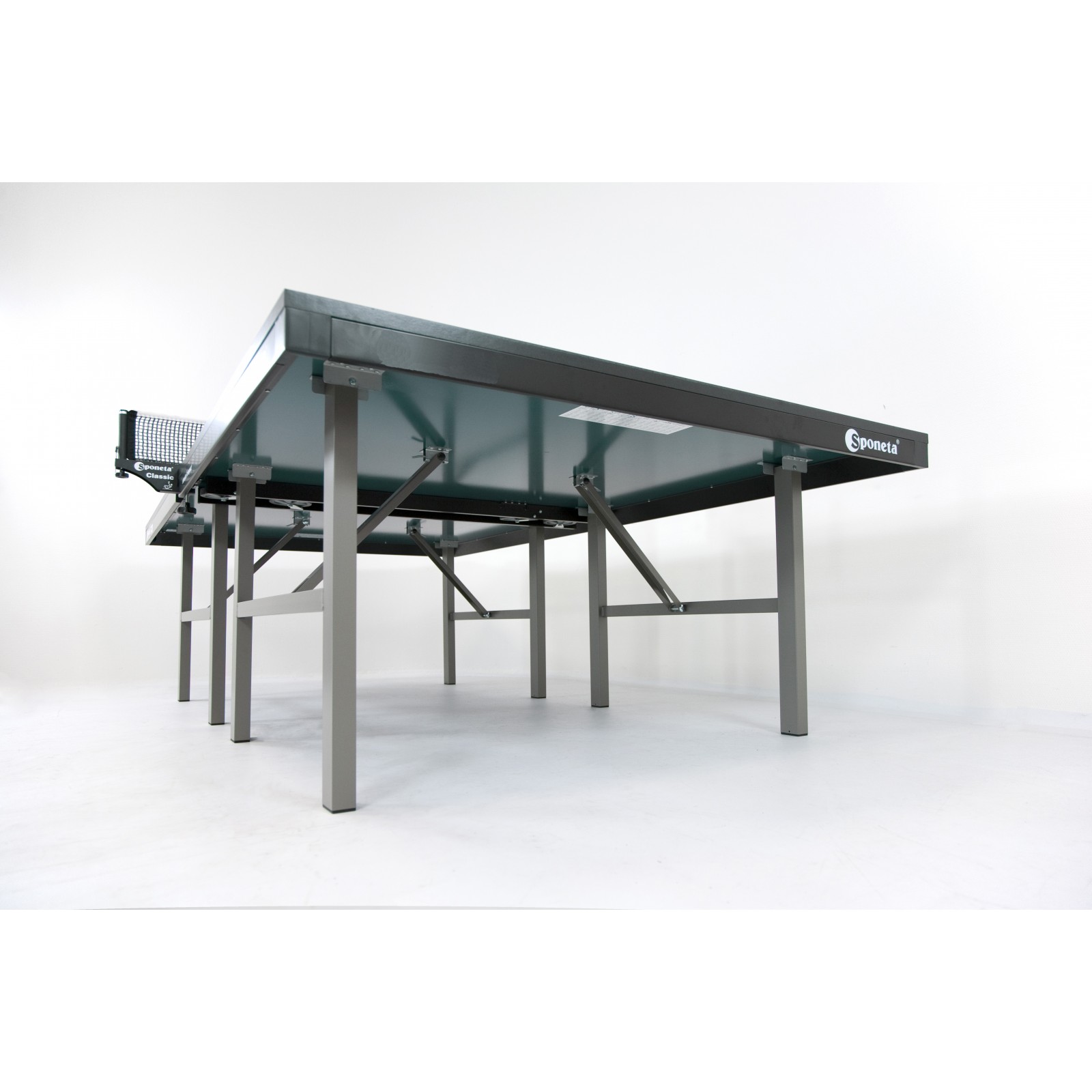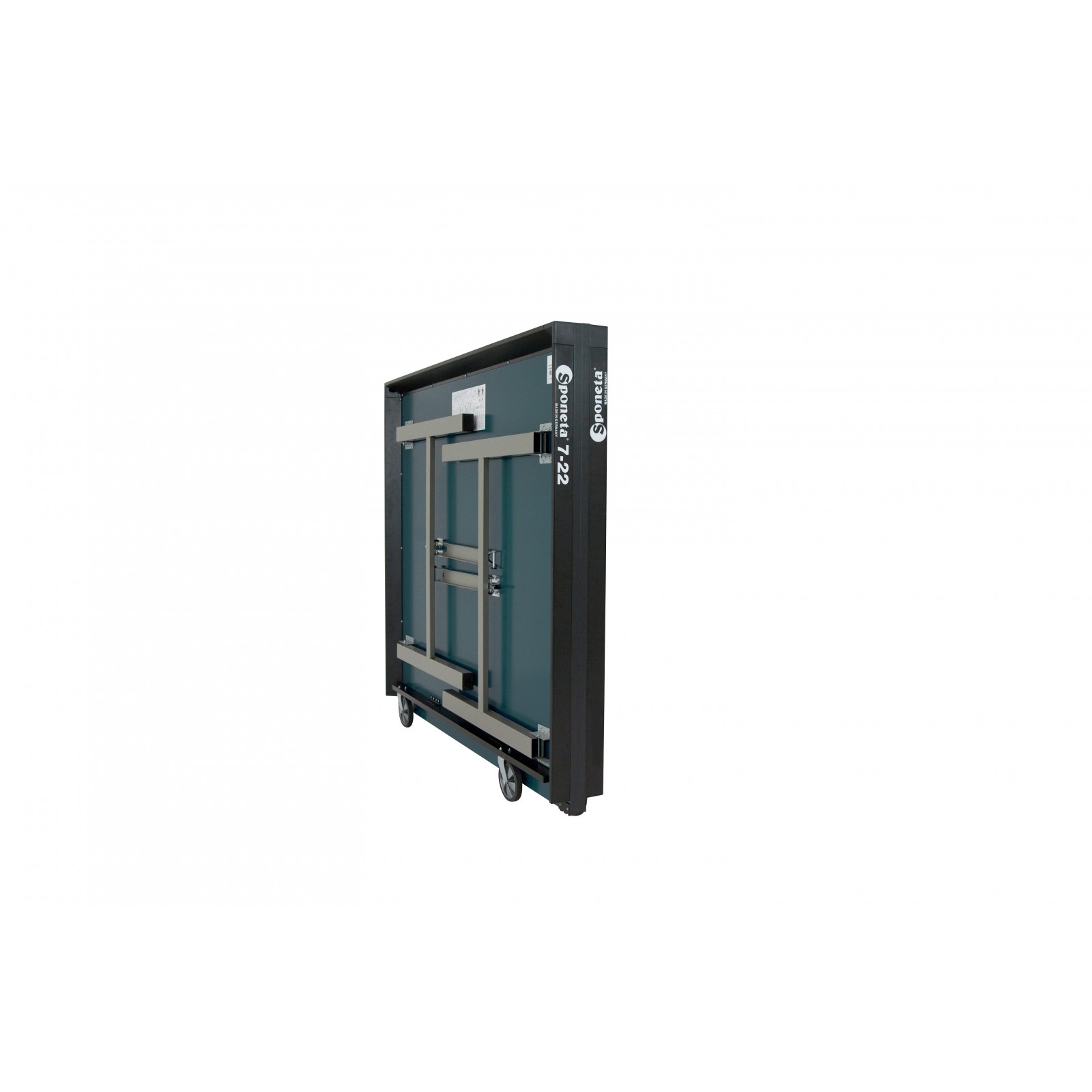 Die Sponeta Tischtennisplatte S7-22/S7-23 gehört zu den Indoor-Tischtennisplatten der Sponeta Profiline. Der Sponeta Tischtennisplatte S7-23 besitzt an den Standfüßen keine Transportrollen. Bei dieser Tischtennisplatte sind an der Unterseite der einzelnen Platten Rollen befestigt mit denen die Plattenhälften bewegt werden können. Der große Vorteil daran ist, dass die Platte sehr platzsparend gelagert werden kann.