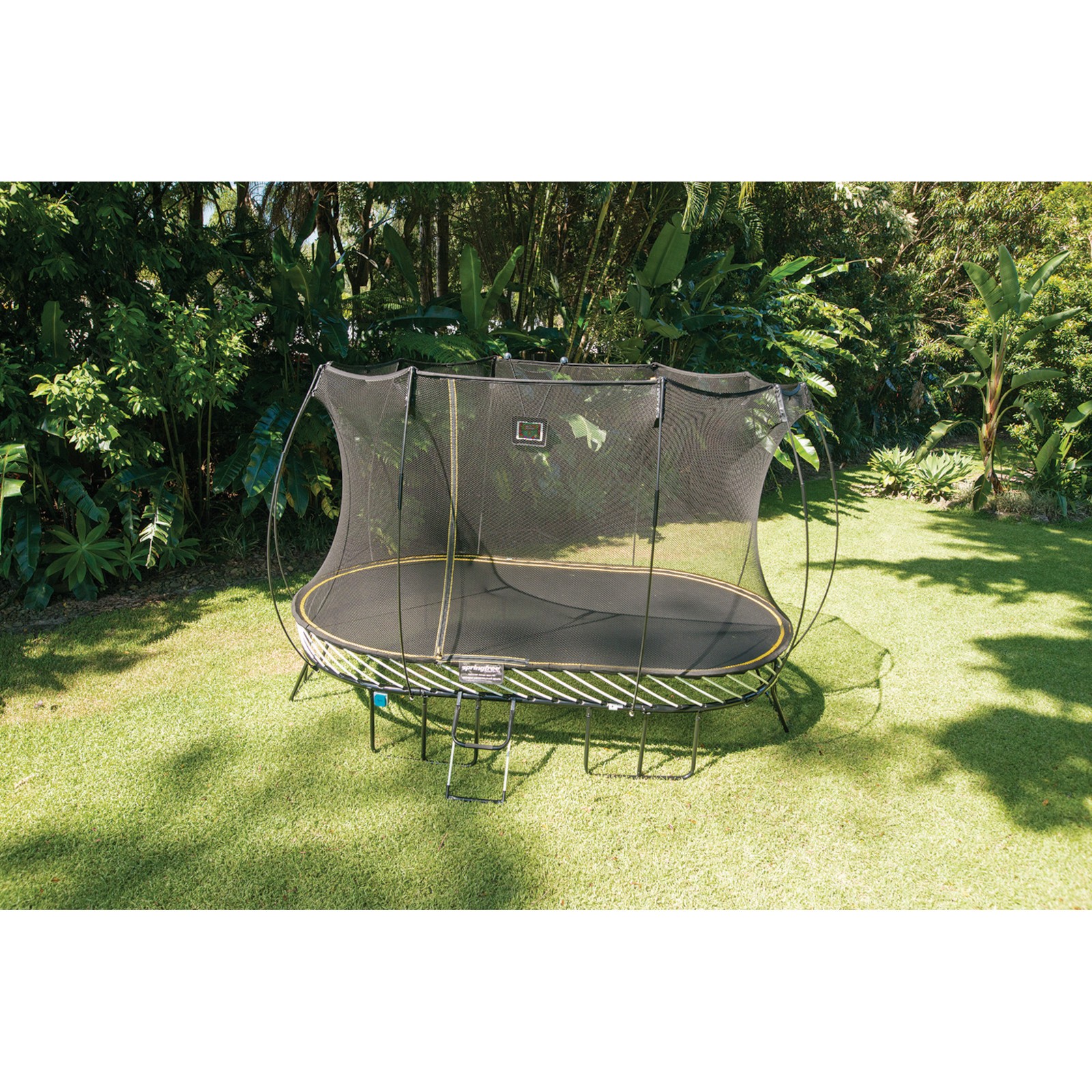Das ovale Springfree Trampolin O92 Large Oval hat eine Sprungfläche von 2,40 x 4 m. Dadurch ist es gut geeignet für mittelgroße Gärten. Durch das maximale Benutzergewicht von 100 kg ist das Trampolin für Klein und Groß nutzbar.