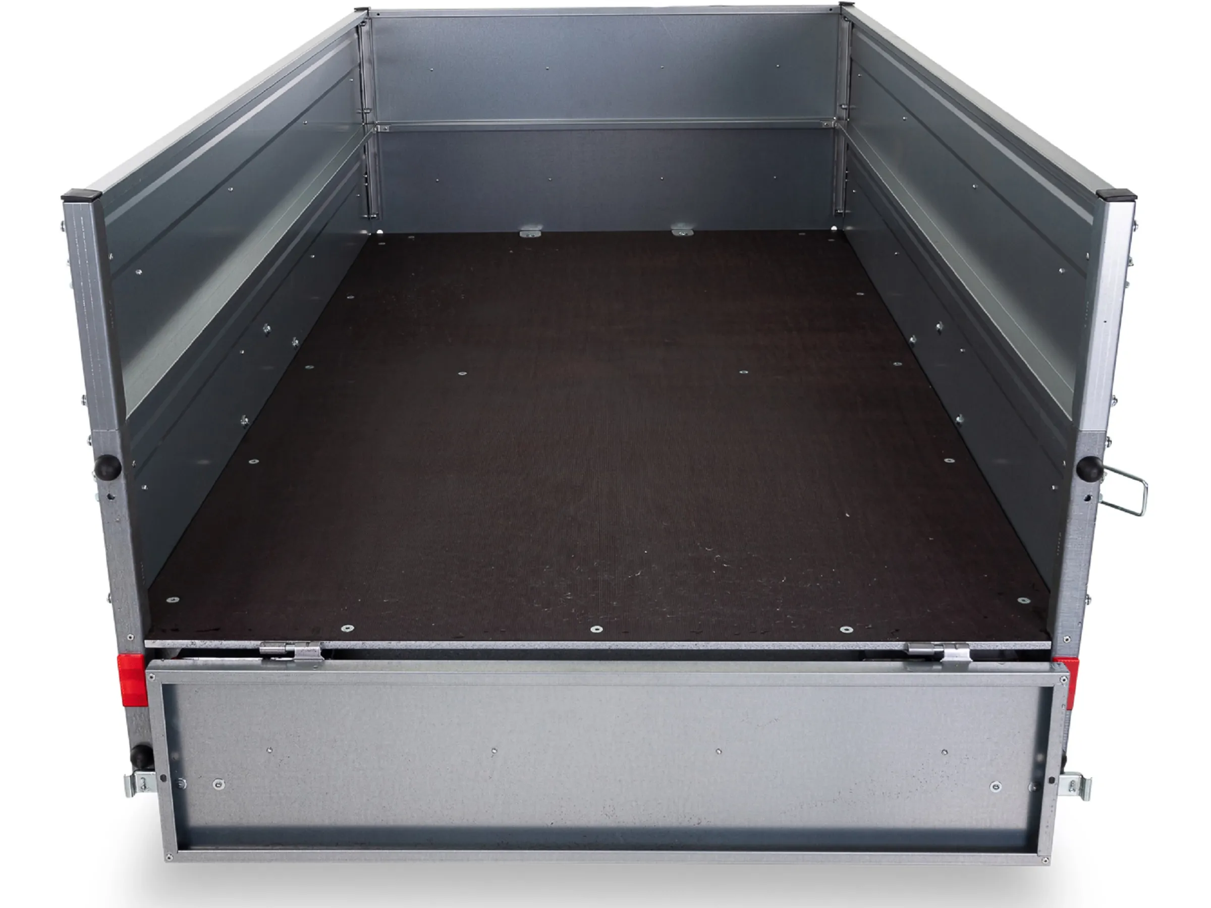 Die verzinkte Bordwand hat eine Höhe von 26 cm. Beide Seitenwände haben eine kleine Rollsicke. Vorder- und Rückwand sind glatt. Die Rückwand ist klapp- und aushängbar und mit stabilen Spannverschlüssen ausgestattet.