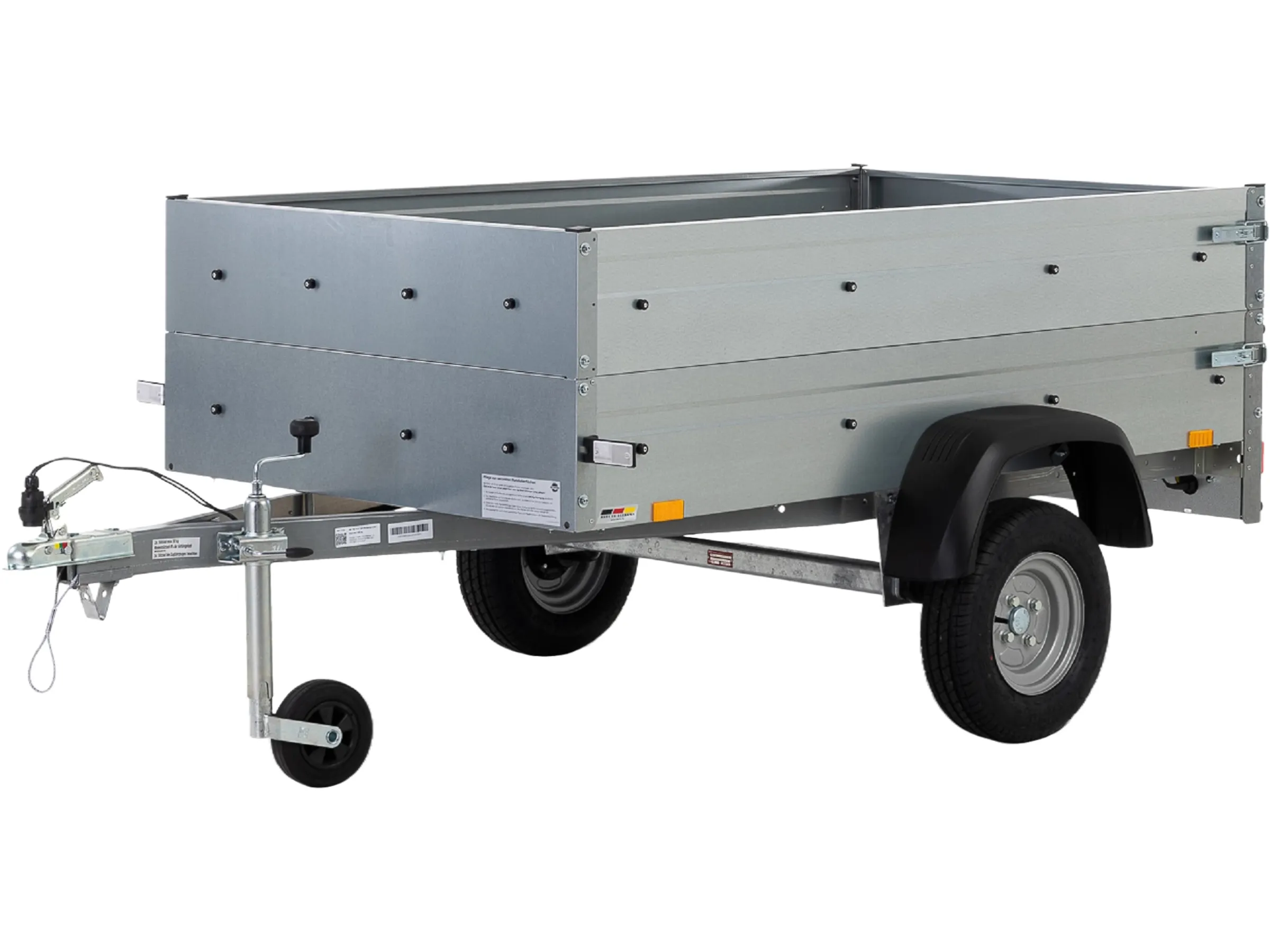 Weitere Merkmale des Anhängers sind die großdimensionierte Multifunktionsrückleuchten inklusive Nebelschlussleuchte, der 7-polige Elektroanschluss, schwarze Kunststoffkotflügel, Sicherheitsanzeige an der Kugelkopfkupplung und viele revisionsfreundliche Schraubverbindungen. Der Boden besteht aus wasserfest verleimtem Mehrschichtholz mit phenolharzbeschichteter, rutschhemmender Oberfläche.
