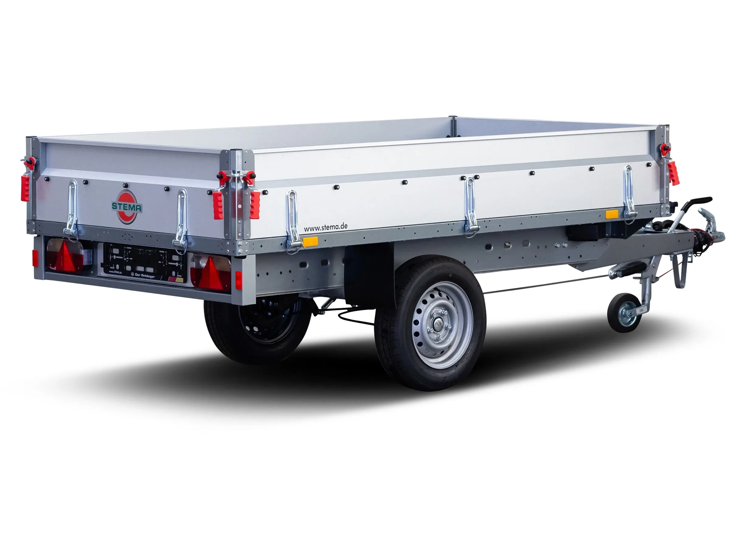 Weitere Highlights des Anhängers sind ein angebautes Stützrad, 13-poligem Elektroanschluss, Auflaufbremse mit Rückfahrautomatik, Multifunktionsrückleuchten inklusive Nebelschlussleuchte und einem Rückfahrscheinwerfer, 1 Paar Unterlegkeile, Stema-Sicherheitsverschlüssen an der Rückwand mit rotem Soft-Griff sowie vielen revisionsfreundlichen Schraubverbindungen.
