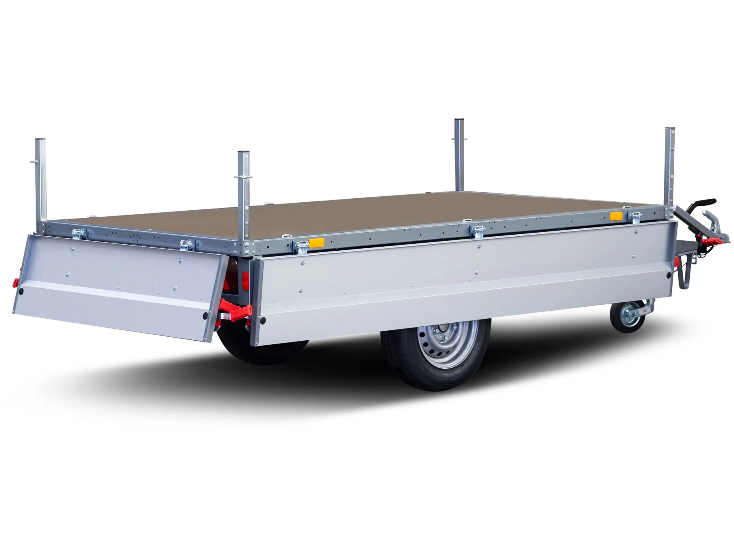 Durch seine Ausführung als Hochlader erreicht er eine schmale Bauform ohne seitlich herausstehende Räder. Dies ermöglicht das Herunterklappen und Abnehmen der Bordwände an allen vier Seiten. Das Beladen wird so vereinfacht und Beschädigungen vermieden. Gipskartonplatten, Holz, aber auch Möbel und andere sperrige Dinge lassen sich so sicher verladen und transportieren.
