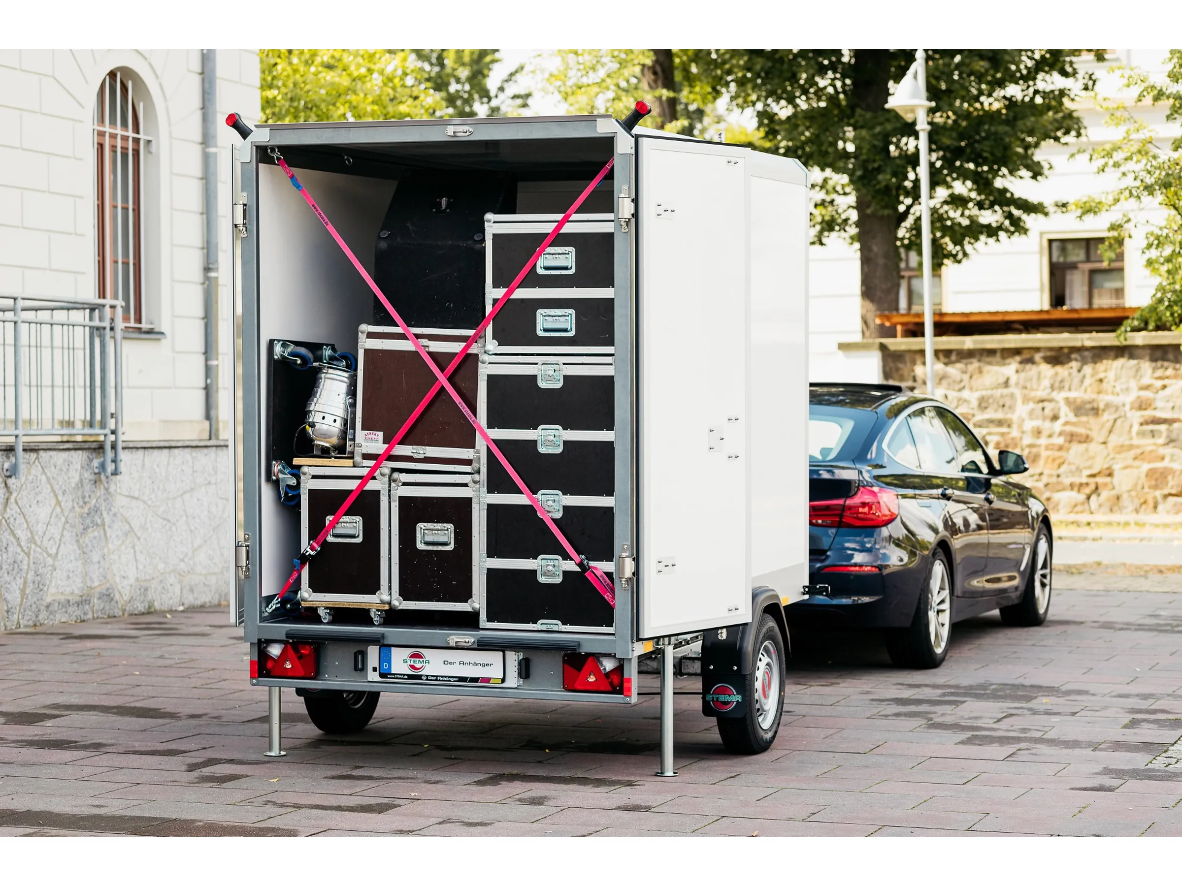 Der STEMA Anhänger ist mit einem Stützrad, 13-poligen Elektroanschluss inkl. Rückfahrscheinwerfer, 2 Abstellstützen und Unterlegkeilen ausgestattet.