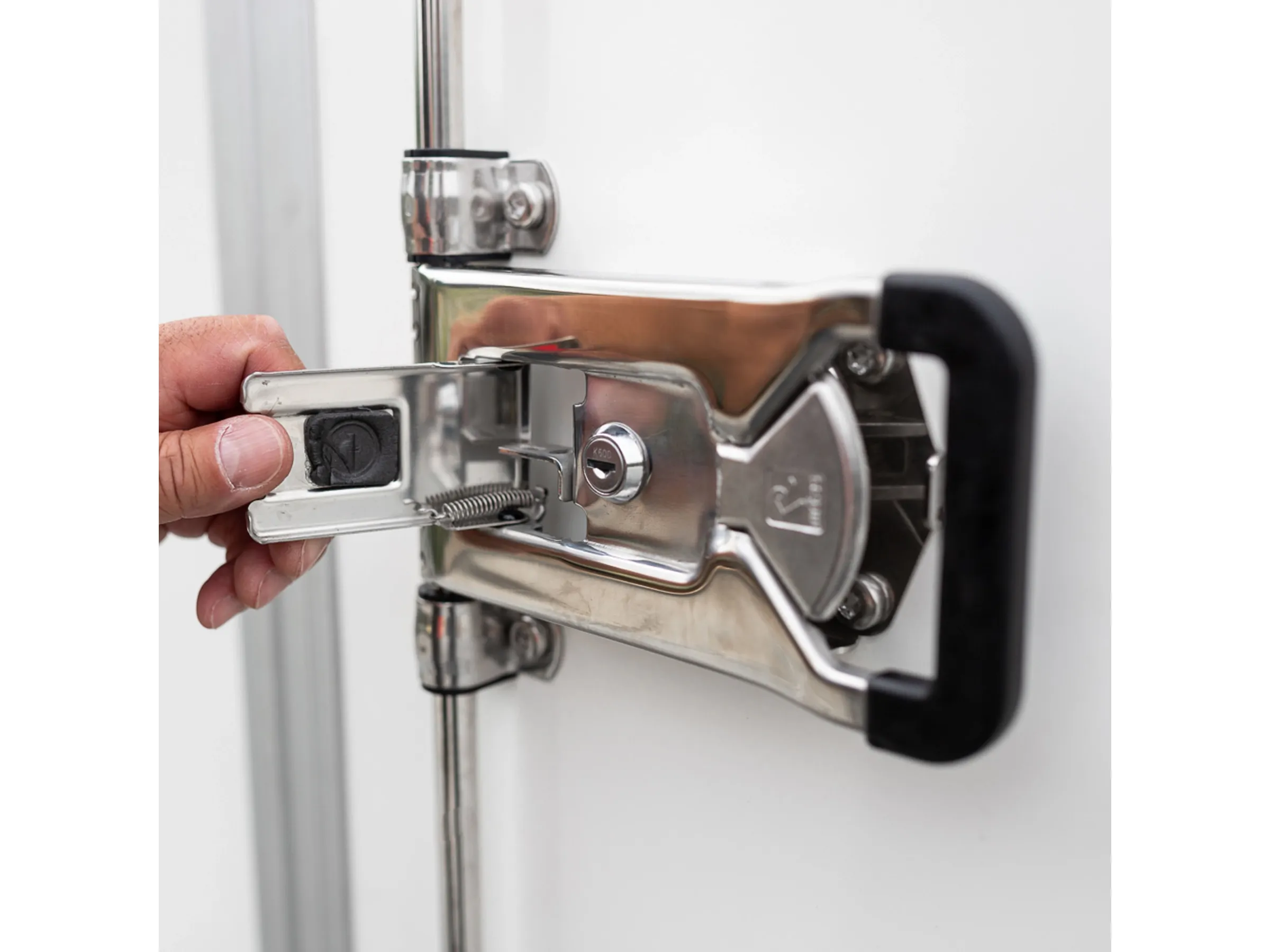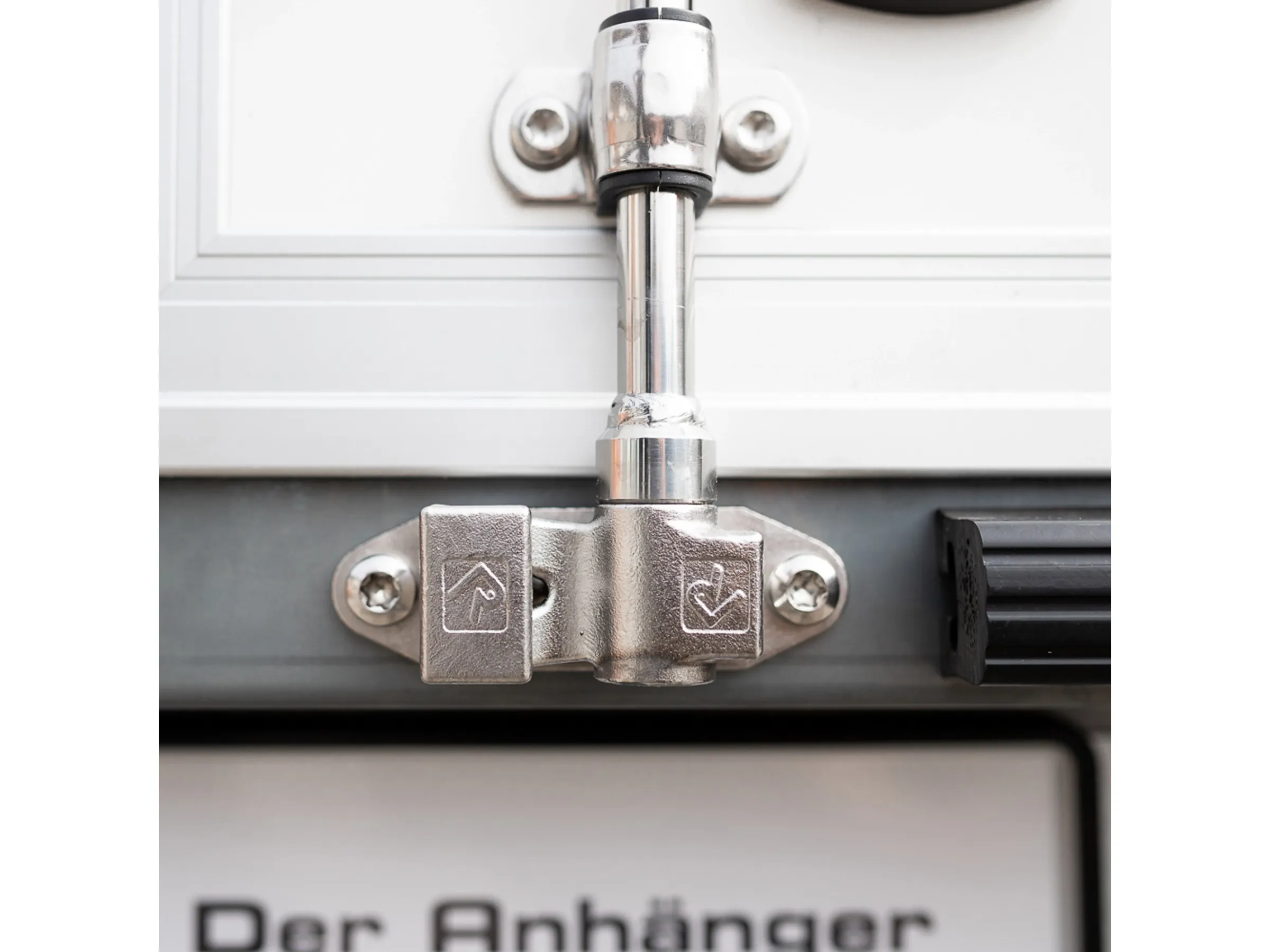 Durch die wetterfeste Edelstahlabdeckung wird das Schloss des Drehstangenverschlusses von allen äußeren Einflüssen abgedeckt und geschützt. Gegen Diebstahl ist Vorsorge getroffen worden. Die Bolzen der Türscharniere sind zum Abschluss mit einer Mutter gesichert, die sich mit handelsüblichen Werkzeug nicht lösen lässt.