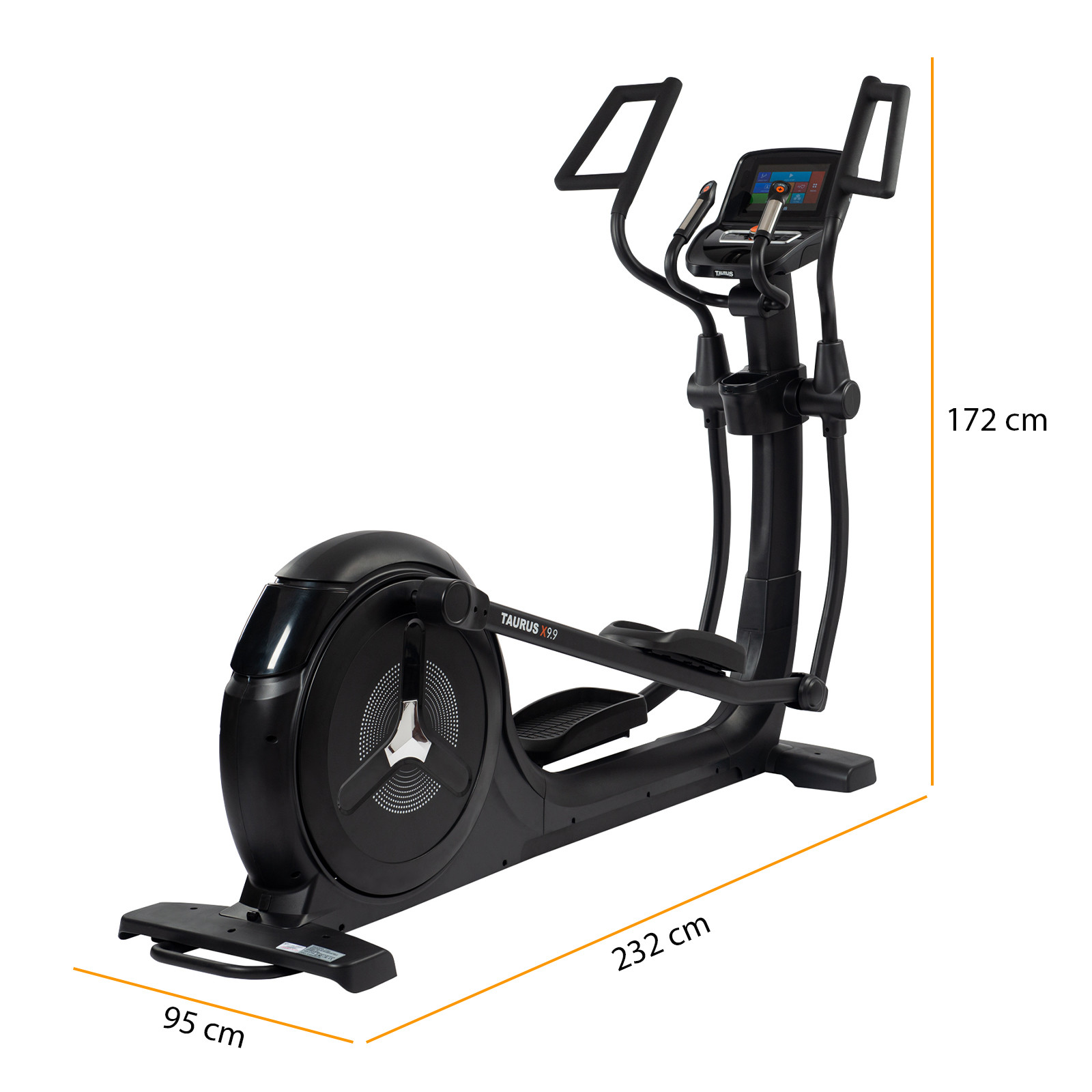 - Aufstellmaße – Taurus Crosstrainer X9.9 Touch: (L) 232 cm x (B) 95 cm x (H) 172 cm