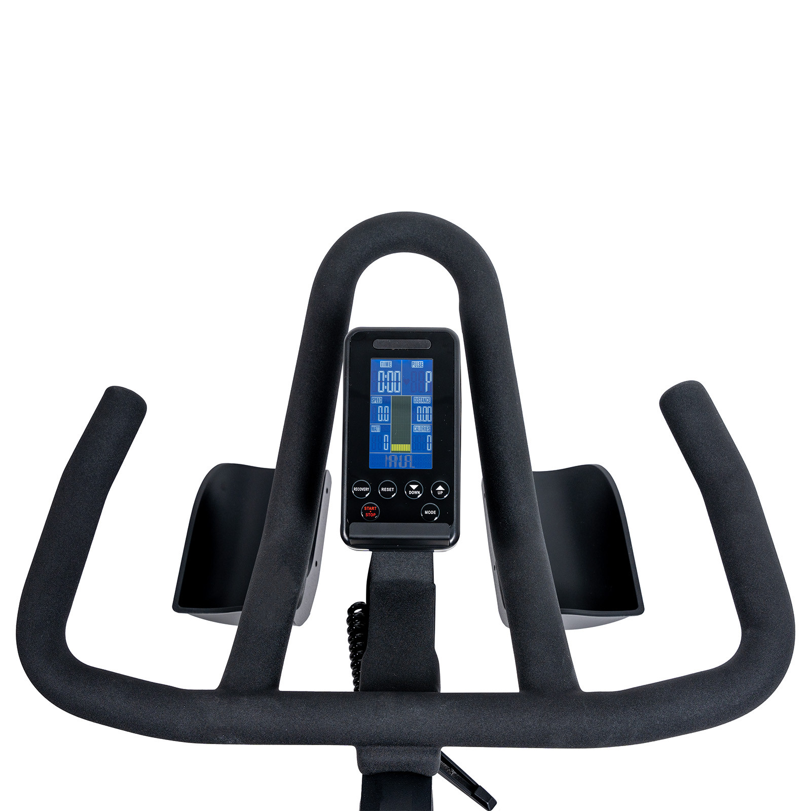 - Anzeige: Zeit, Strecke, Geschwindigkeit, Watt, RPM, Kalorien, Puls