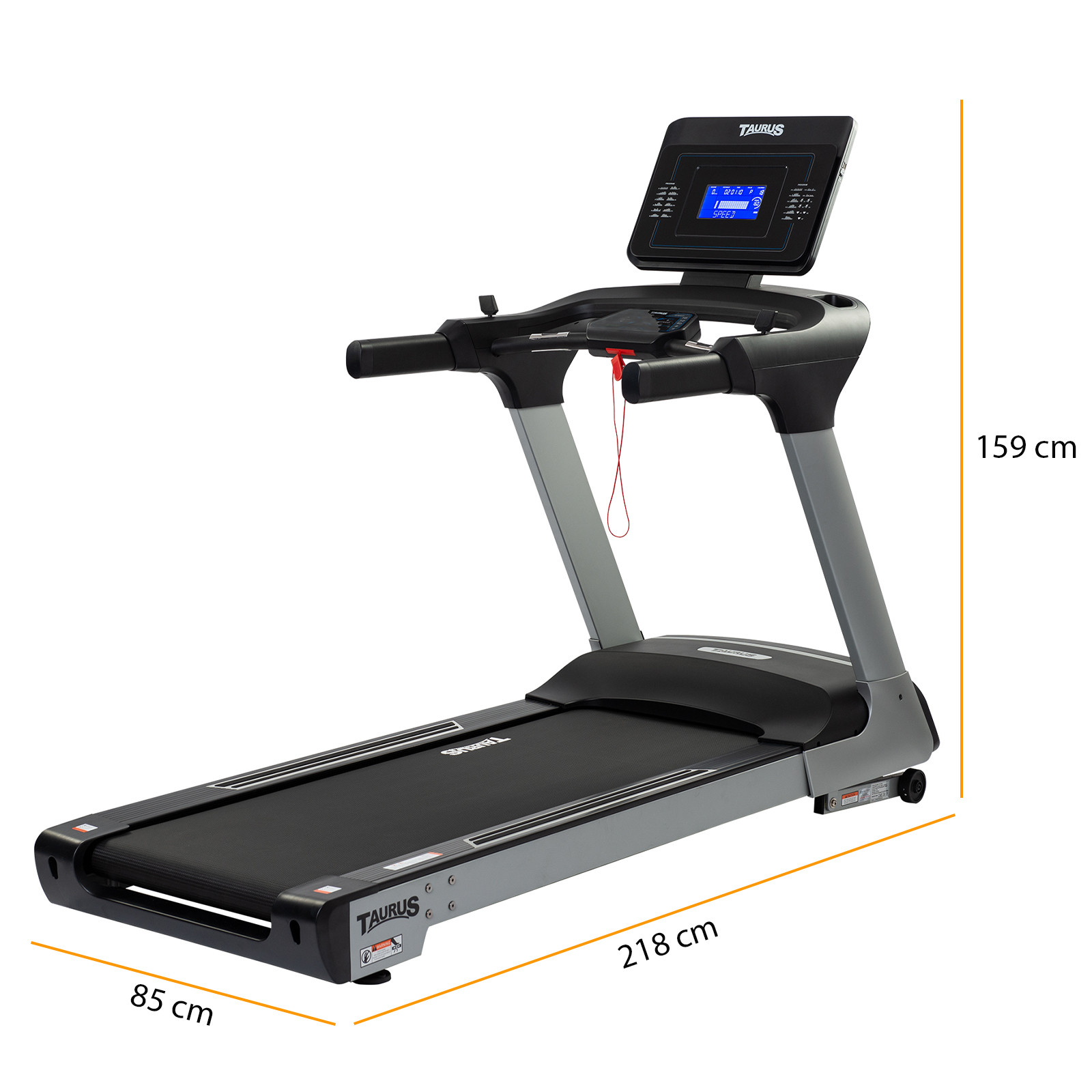 - Aufstellmaße – Taurus Laufband T9.5: (L) 215 cm x (B) 85 cm x (H) 159 cm
