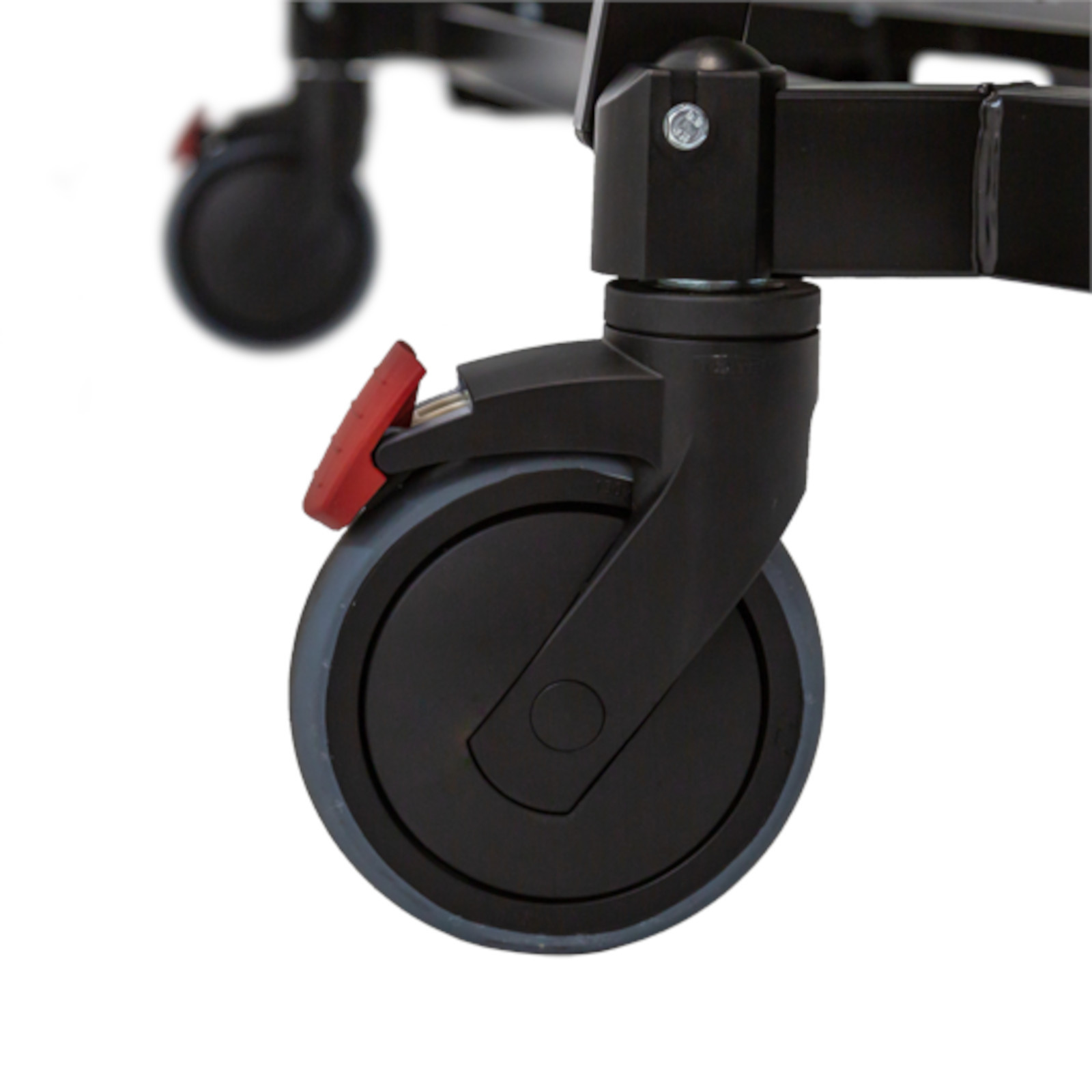- Schwenkbare und gummierte Räder mit Arretierung und sehr guten Dämpfungseigenschaften