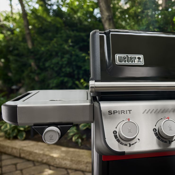 • Robustes Design: Edelstahl-Bedienfeld und feststehende Seitentische mit Weber WORKS Zubehörleiste.