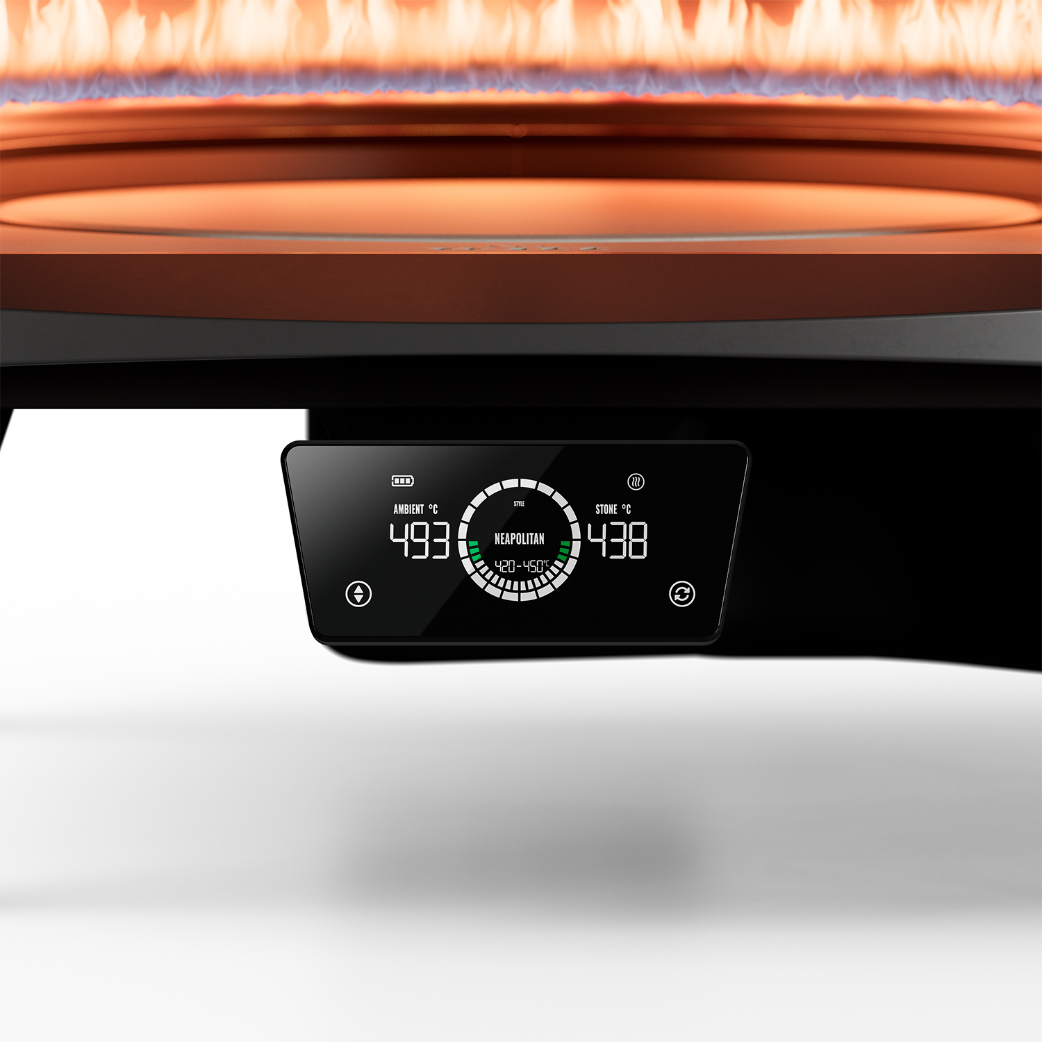 Für eine präzise und zuverlässige Temperaturkontrolle ist der Pizzaofen mit drei hochsensiblen Sensoren ausgestattet. Zwei messen exakt die Hitze im Garraum, während der dritte direkt unter dem Pizzastein sitzt und so die perfekte Steintemperatur sicherstellt. Alle Werte lassen sich komfortabel auf dem klar strukturierten Display ablesen. Ergänzend informiert das Display über den Status des Booster-Brenners sowie die Rotation des Pizzasteins – damit haben Sie sämtliche entscheidenden Parameter jederzeit voll im Blick.